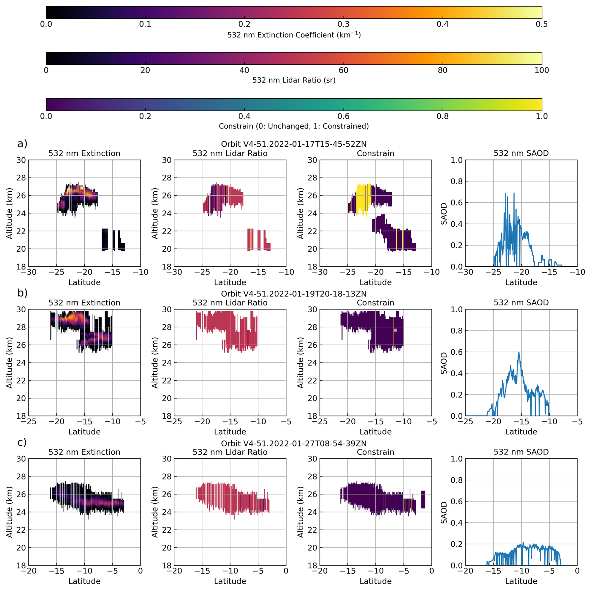 Figure A13 CALIOP night orbits on 17 January (a, C2), 19 (b, C1) and 27 (c). For each panel, from left to right, are represented the 532 nm extinction coefficient, the 532 nm LR (extinction/backscatter), whether the LR is constrained (1) or not (0) to retrieve the extinction and the 532 nm stratospheric AOD (SAOD).