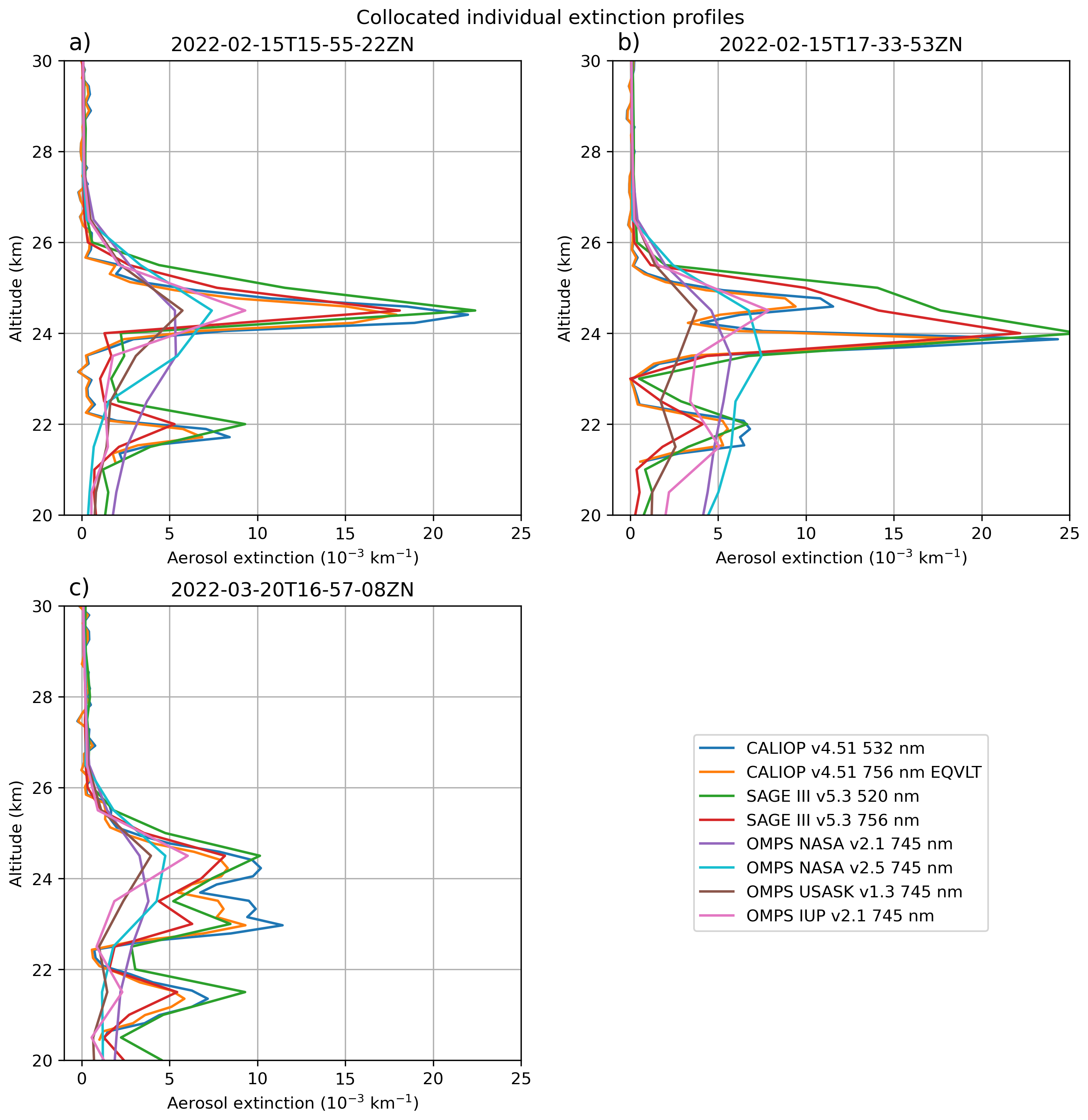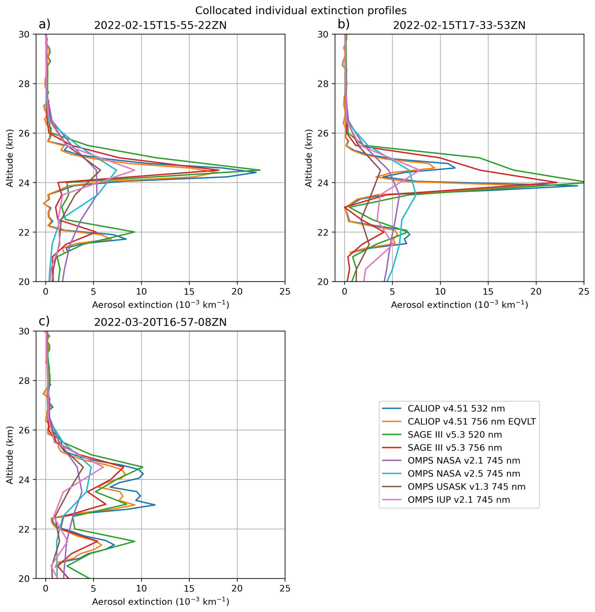 In order to test our method, we compare the results with extinction profile data from passive spaceborne sensors at coinciding measurement points. Figure 5a and b show collocated individual profiles of CALIOP, SAGE III and OMPS-LP on 15 February near the equator and 20 March near 20° S. Such coincidences are rare events over the period due to the scarce spatiotemporal sampling of SAGE III profiles (see Sect. 2.3). In both cases, the very good agreement between CALIOP and SAGE III extinction profiles is striking in terms of profile shape and values. Data from the three OMPS-LP products agree regarding the altitude of the extinction peak, but significantly underestimate its magnitude compared to direct extinction measurements from SAGE III, which we take as a reference (see Sect. 2.3). The discrepancy arises from the limited sensitivity of OMPS-LP in the early stages, as its long limb path prevents it from seeing into the plume effectively and the retrieval dependency on particle size assumptions (Bourassa et al., 2023). The gap becomes smaller with time as the plume gets diluted, as seen by comparing 20 March with 15 February. The IUP v2.1 and NASA v2.5 exhibit higher peak values than the other versions, bringing them closer in magnitude to SAGE III and CALIOP. Below the peak, the larger extinction in NASA v2.1 is due to an artifact originating from a convergence problem in the algorithm inducing a larger AOD when integrated. This issue was addressed in NASA v2.5 by substantially increasing the number of iterations (Taha et al., 2025), and was reduced in v2.5, although not completely eliminated. These results are consistently observed in other cases of coincidences (see Appendix D).