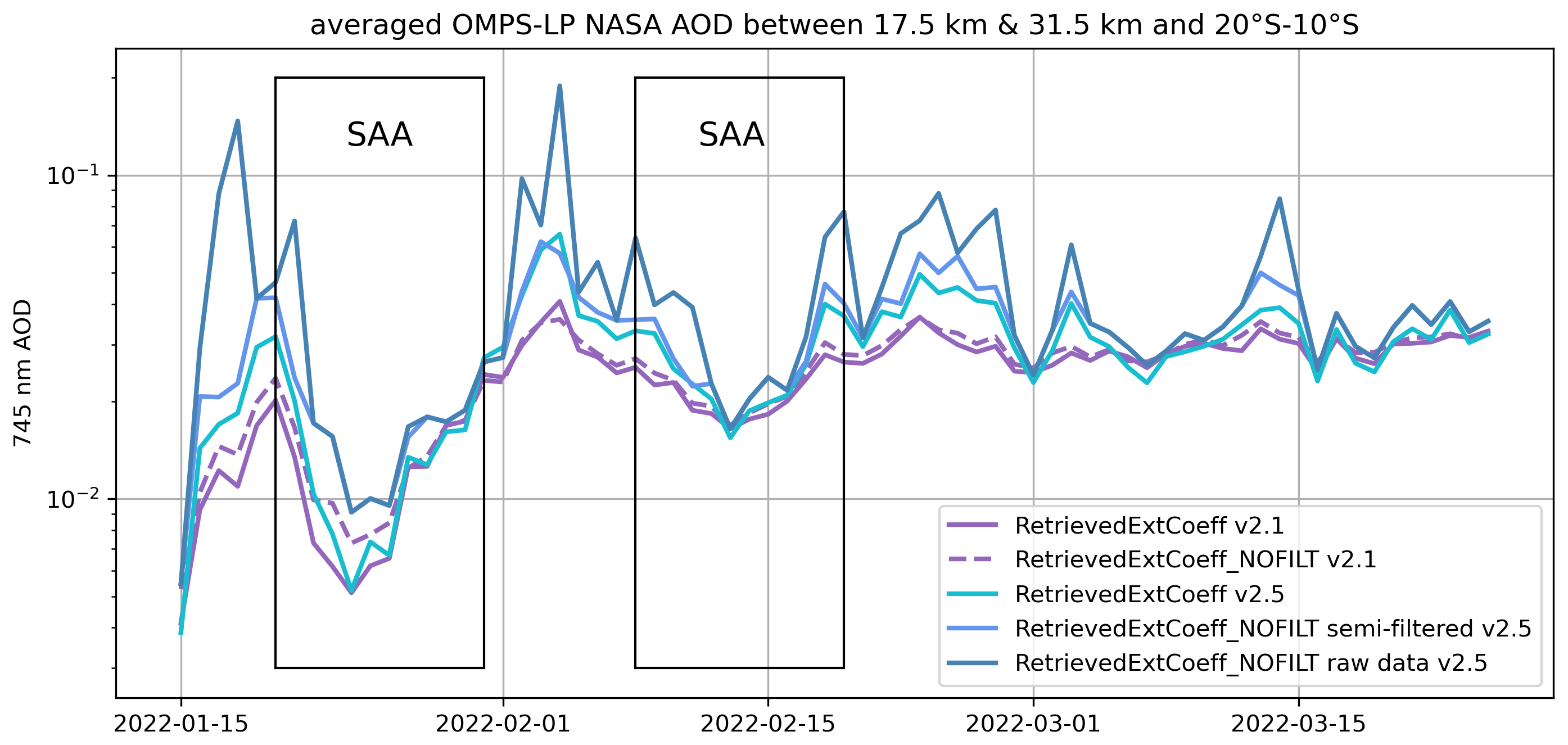 The Ozone Mapping and Profiler Suite Limb Profiler (OMPS-LP) instrument, on board the Suomi-NPP satellite, provides aerosol extinction profiles from measurements of the scattered solar radiation in 1 km vertical steps. In this study, we use the 745 nm band from versions v2.1 and v2.5 of the aerosol extinction retrieval algorithm developed by NASA (Taha et al., 2021) and two other OMPS-LP products: the 745 nm band of the v1.3 aerosol extinction product developed by the University of Saskatchewan (USASK) (Bourassa et al., 2023) and the 869 nm band of the v2.1 aerosol extinction coefficient product developed by the Institute of Environmental Physics (IUP) after a conversion to 745 nm (Rozanov et al., 2024). Of the three slits separated by 250 km at the tangent point designed to observe the atmosphere (Jaross et al., 2014), we use the middle one as it has better straylight performance and pointing knowledge. The extinction is averaged daily over all orbits of that day outside the SAA zone and after a horizontal interpolation to a standard latitude grid of 1.1° resolution that corresponds to the mean resolution of OMPS-LP in the considered range of latitudes.