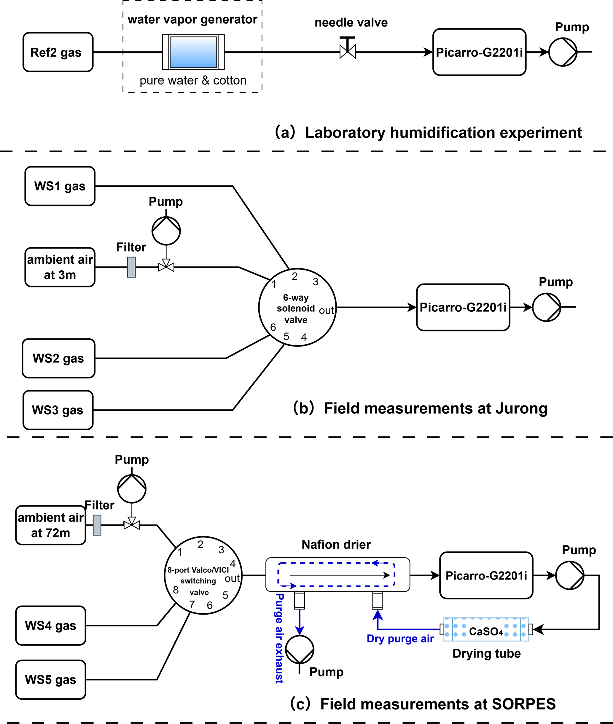 Figure 1Laboratory and field setups for CH4 and δ13 CH4 measurements using a Picarro G2201-i analyzer. (a) Laboratory setup for deriving the water vapor correction function using humidified Ref2 gas. (b) Field setup at the Jurong site using WS1–WS3 and ambient air at 3 m above the ground, streams selected via a solenoid valve. (c) Field setup at the SORPES site with WS4–WS5 and ambient air sampled at 72 m above the ground, equipped with a Nafion™ dryer. Note that a 6-way solenoid valve was used at Jurong, whereas an 8-port Valco or VICI switching valve was used at SORPES.