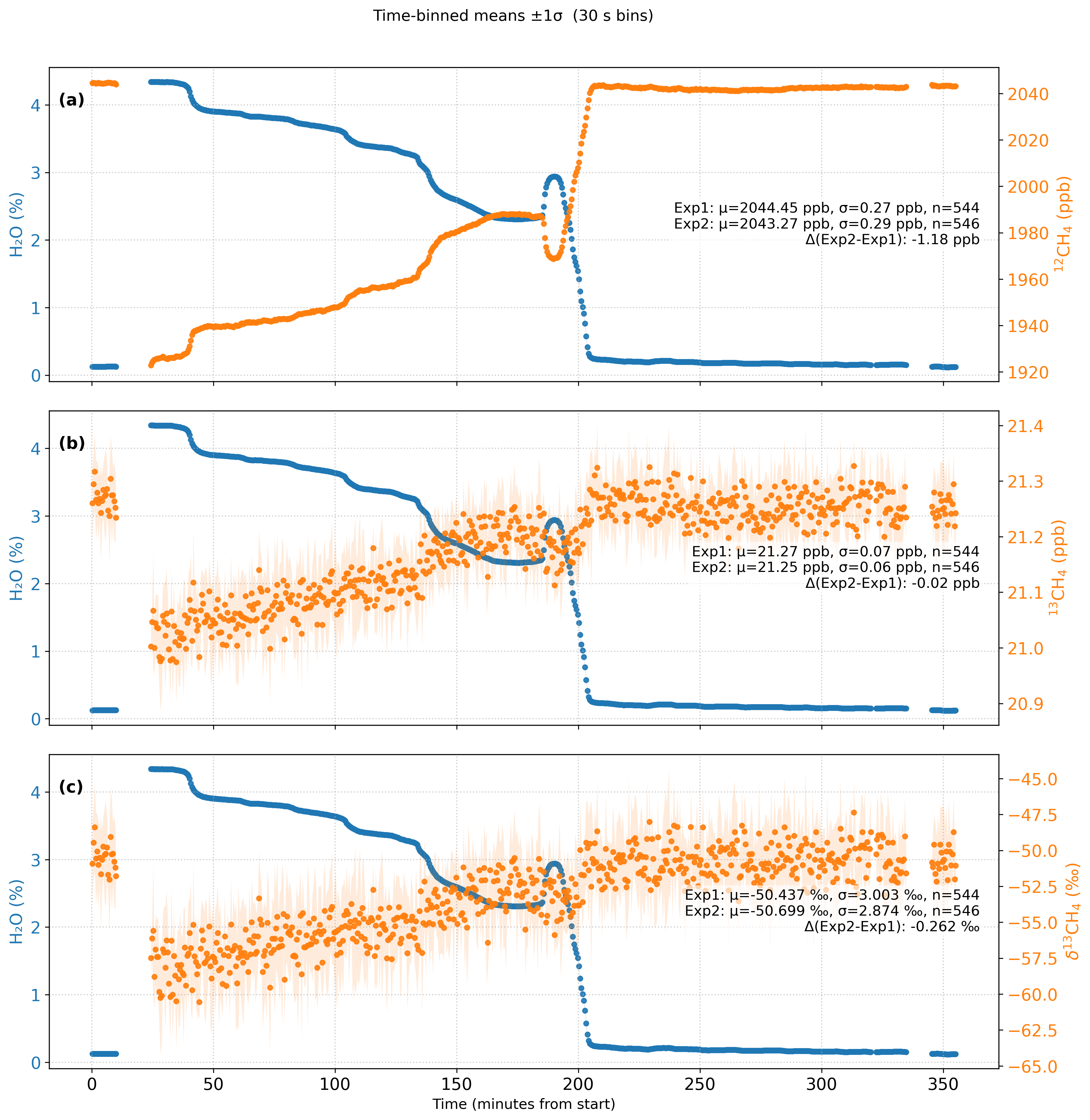Figure 2Time series of H2O, 12CH4, 13CH4, and δ13CH4 during the controlled humidity experiment. Each point represents a 30 s mean value, and the shaded areas indicate the 1σ standard deviation of each bin. Exp1 and Exp2 correspond to the dry reference gas measurements performed before and after the artificially humidified period, respectively. The annotated statistics in each panel show the mean (μ), standard deviation (σ), number of averaged points (n), and the drift (ΔExp2–Exp1), demonstrating the measurement stability of 12CH4, 13CH4, and δ13CH4 across the humidified period. H2O represents the water vapor mole fraction (in %).