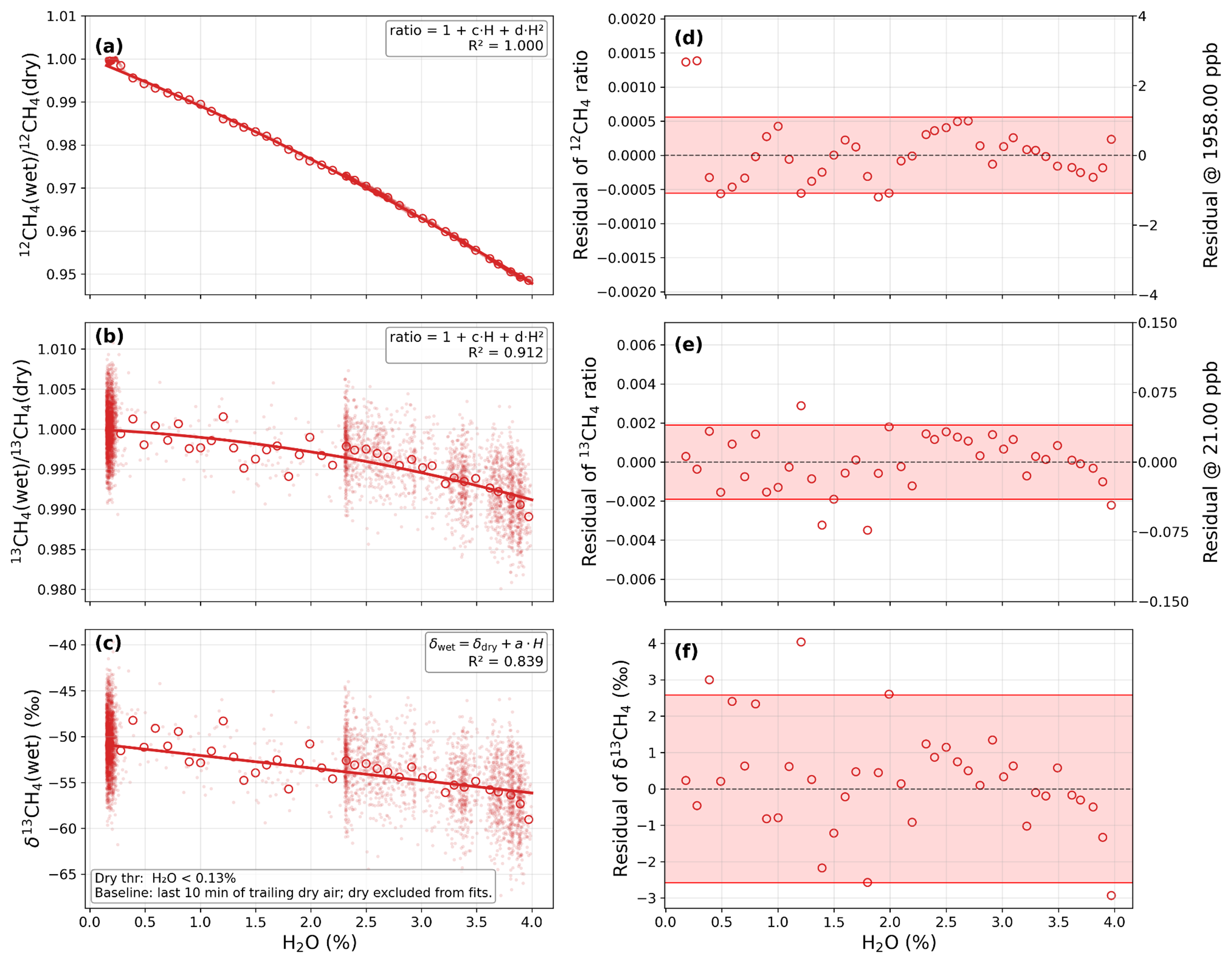 Figure 3Water vapor correction functions for 12CH4, 13CH4, and δ13CH4 derived from laboratory water vapor experiments (0.15 %–4.0 % H2O). Panels (a), (b), and (c) show the fitted relationships between H2O concentration and the wet-to-dry ratios of 12CH4, the wet-to-dry ratios of 13CH4, and the δ13CH4 deviation (δ13CH4, wet – δ13CH4, dry), respectively. Each open circle represents the mean value within a 0.1 % H2O bin. The solid red lines indicate the best-fit regression models (quadratic for 12CH4 and 13CH4, linear for δ13CH4), and small points indicate raw observations. Panels (d), (e), and (f) show the corresponding residuals; the red shaded bands indicate the interval containing 90 % of the data points, with parameters detailed in Table 3.