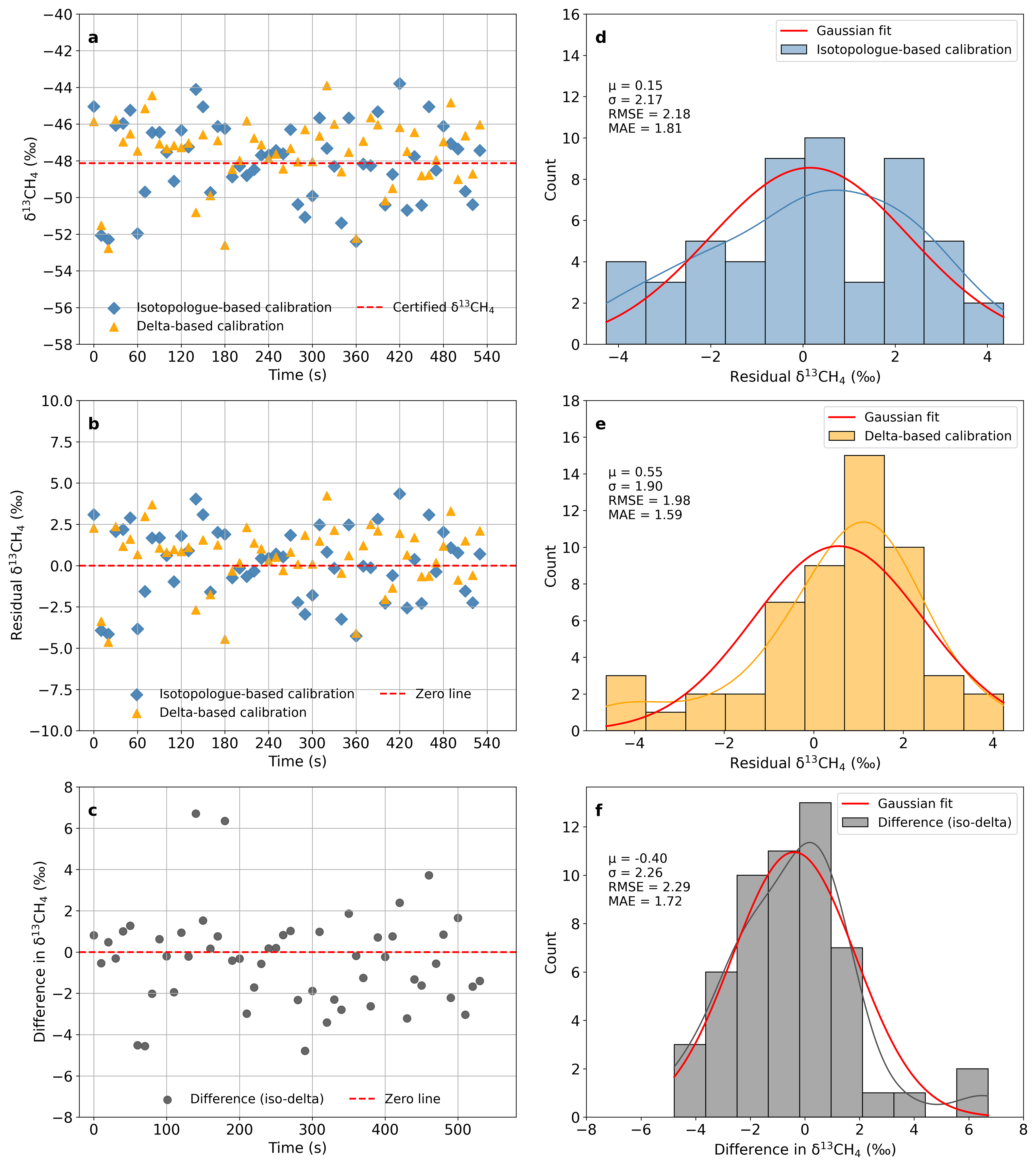 Figure 4Comparison of δ13CH4 calibration strategies for a dry reference gas. (a) Calibrated δ13CH4 from isotopologue-specific (blue diamonds) and delta-based (yellow triangles) strategies; the reference is shown as a red dashed line. (b) Residuals (calibrated – certified) for both strategies. (c) Time series of the difference between isotopologue-specific and delta-based calibrated δ13CH4 (hereafter referred to as the inter-method difference, iso – delta). (d, e) Histograms of residuals for the two strategies with Gaussian fits. (f) Distribution of the inter-method difference (iso – delta) with a Gaussian fit. For (d)–(f), Gaussian fits provide the mean (μ) and standard deviation (σ), while root-mean-square error (RMSE) and mean absolute error (MAE) are computed from the data. All results are based on 10-s averaged data.
