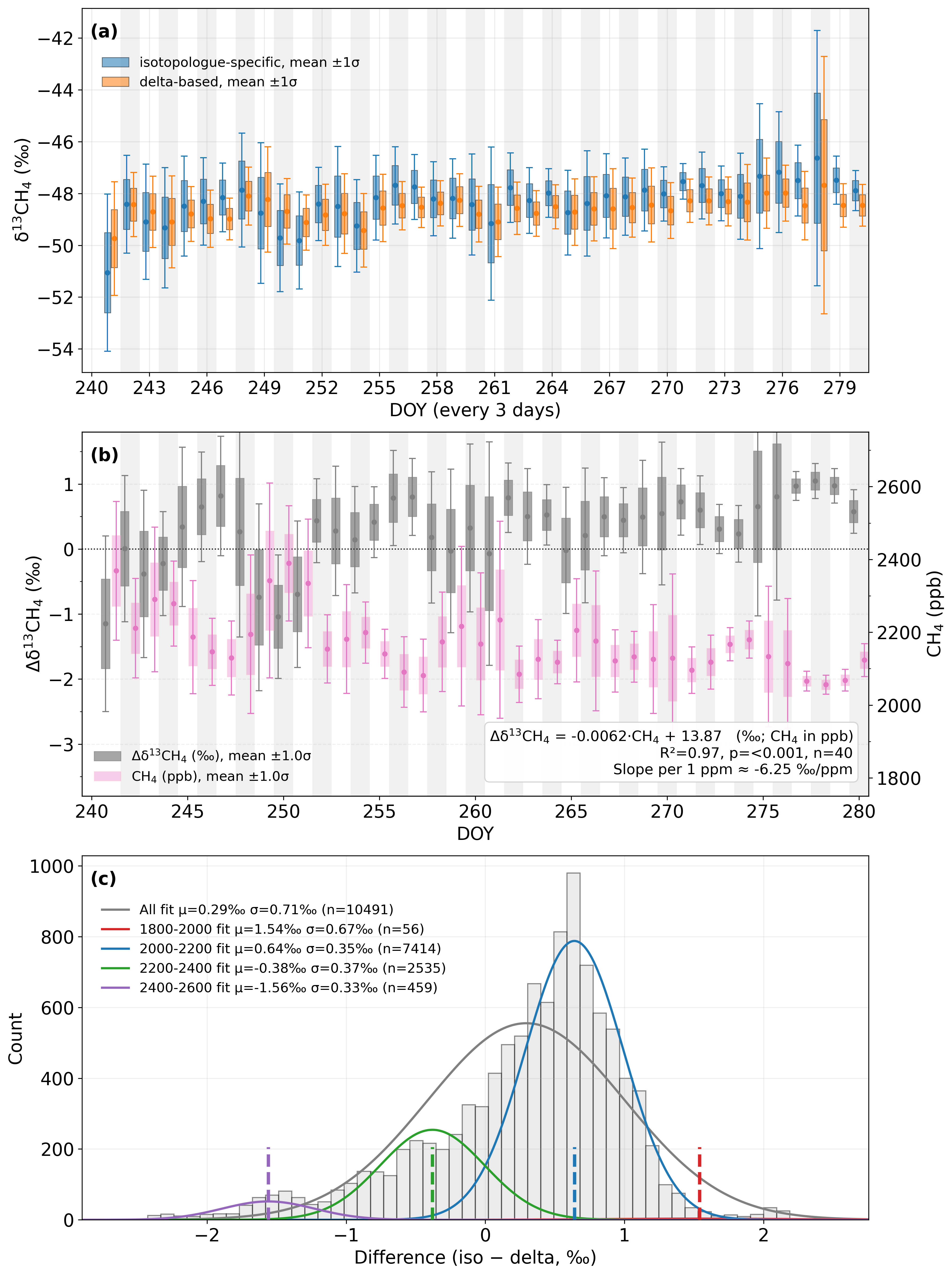 Figure 5Comparison of δ13CH4 calibration strategies at the SORPES station (dried ambient air, DOY 240–280, 2022). (a) Daily averaged δ13CH4 values from isotopologue-specific (blue) and delta-based (orange) calibration strategies, with 1σ standard deviations. (b) Time series of the inter-method difference Δδ13CH4 (iso – delta, grey bars) and corresponding CH4 mole fraction (pink bars, right axis). The linear relationship between Δδ13CH4 and CH4 is shown with a fitted regression. (c) Histogram of Δδ13CH4 (iso − delta) for all data and for different CH4 concentration ranges, each fitted with a Gaussian function. The fitted mean (μ) and standard deviation (σ) are reported for each subset. All analyses are based on 5-min averaged data.