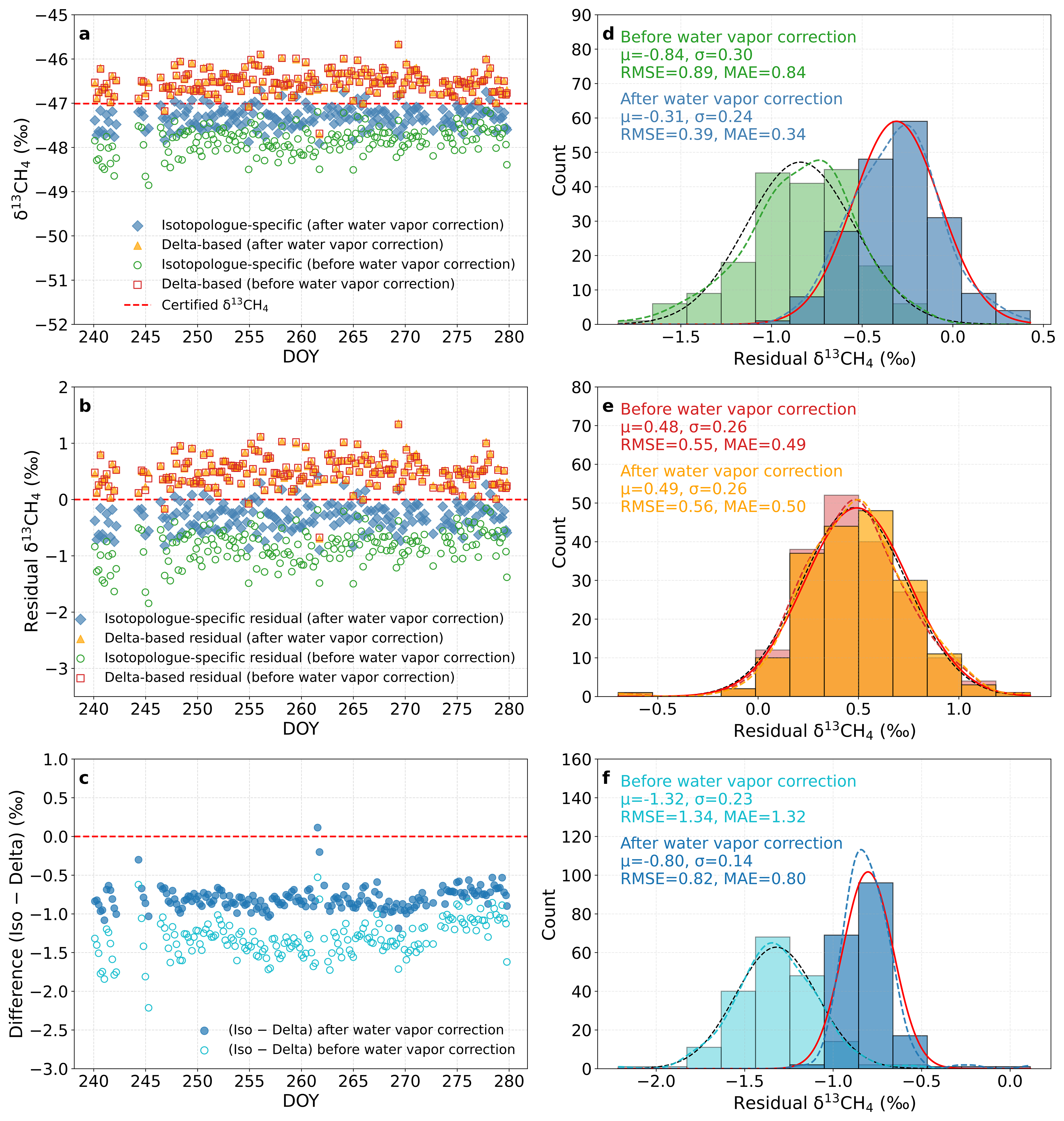 Figure 6Comparison of δ13CH4 calibration strategies for a humidified target gas (rice paddy site, DOY 240–280, 2018). (a) δ13CH4 values from the isotopologue-specific (blue diamonds) and delta-based (orange triangles) calibrations, shown both before (open symbols) and after (filled symbols) applying the water vapor correction. The certified reference value is indicated by the red dashed line. (b) Residuals (calibrated – certified) for both calibration strategies, with open and filled markers representing results before and after water vapor correction, respectively. (c) Time series of the inter-method difference Δδ13CH4= (iso – delta), shown before (open) and after (filled) water vapor correction. (d, e) Histograms of residuals for the two calibration strategies before and after water vapor correction, with Gaussian fits illustrating their respective distributions. (f) Histogram of the inter-method difference (iso − delta) before and after water vapor correction, also fitted with Gaussian functions. For panels (d)–(f), Gaussian fits provide the mean (μ) and standard deviation (σ), while the root-mean-square error (RMSE) and mean absolute error (MAE) are calculated from the data. All results are based on 5-min averaged measurements after applying the empirical water vapor correction equations functions.