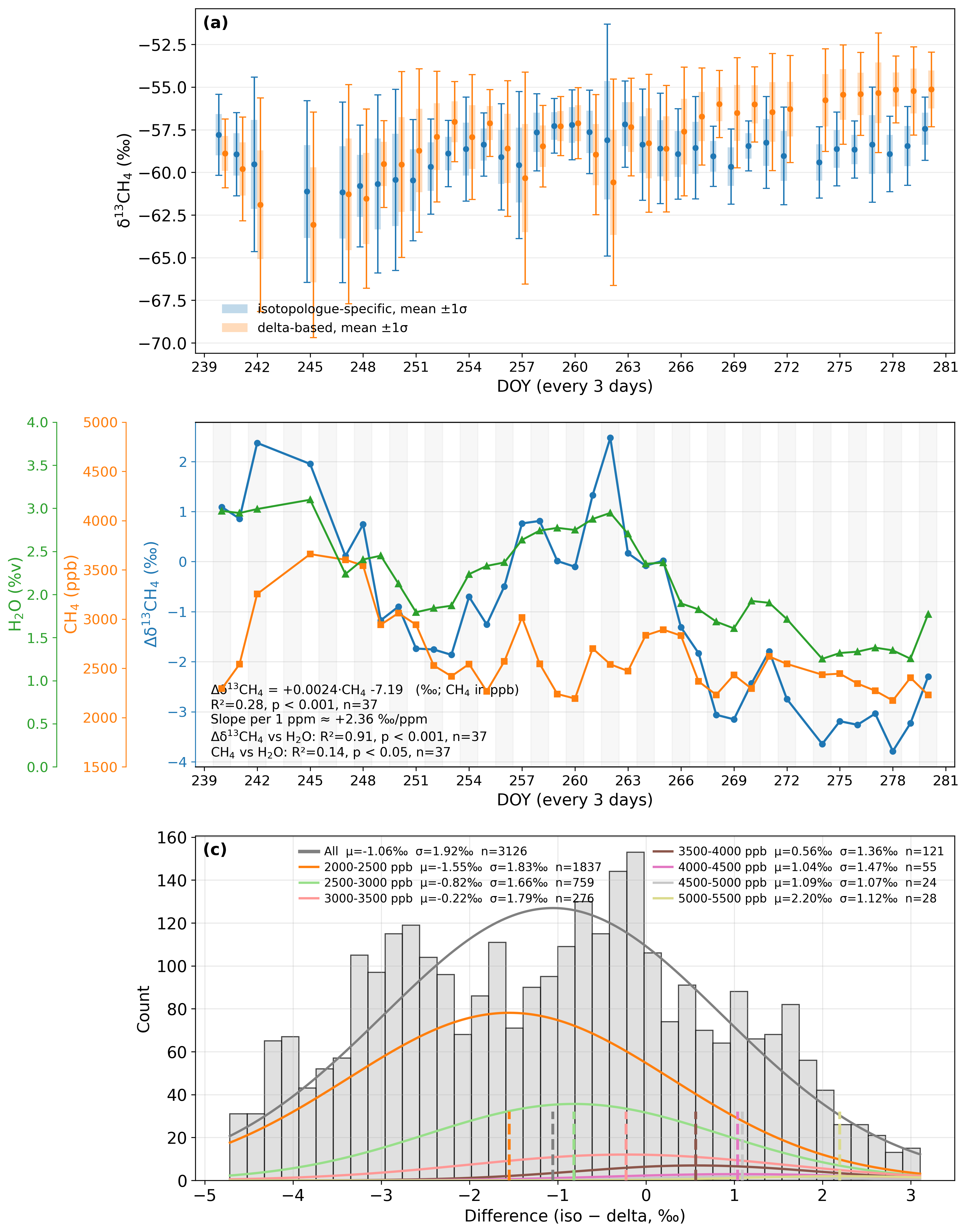 Figure 7Field comparison of δ13CH4 calibration strategies for humid air observations at the rice paddy site (DOY 240–280, 2018). (a) Daily mean δ13CH4 from isotopologue-specific (blue) and delta-based (orange) calibrations (mean ±1σ). (b) Time series of the inter-method difference in δ13CH4 (iso – delta, blue line) together with total CH4 mole fraction (orange line) and H2O concentration (green line, 0.93 % to 3.5 %). (c) Histogram of δ13CH4 differences (iso – delta) grouped by CH4 mole-fraction ranges, each fitted with a Gaussian function. The fitted mean (μ) and standard deviation (σ) are reported for each subset. All results are based on 5-min averages.