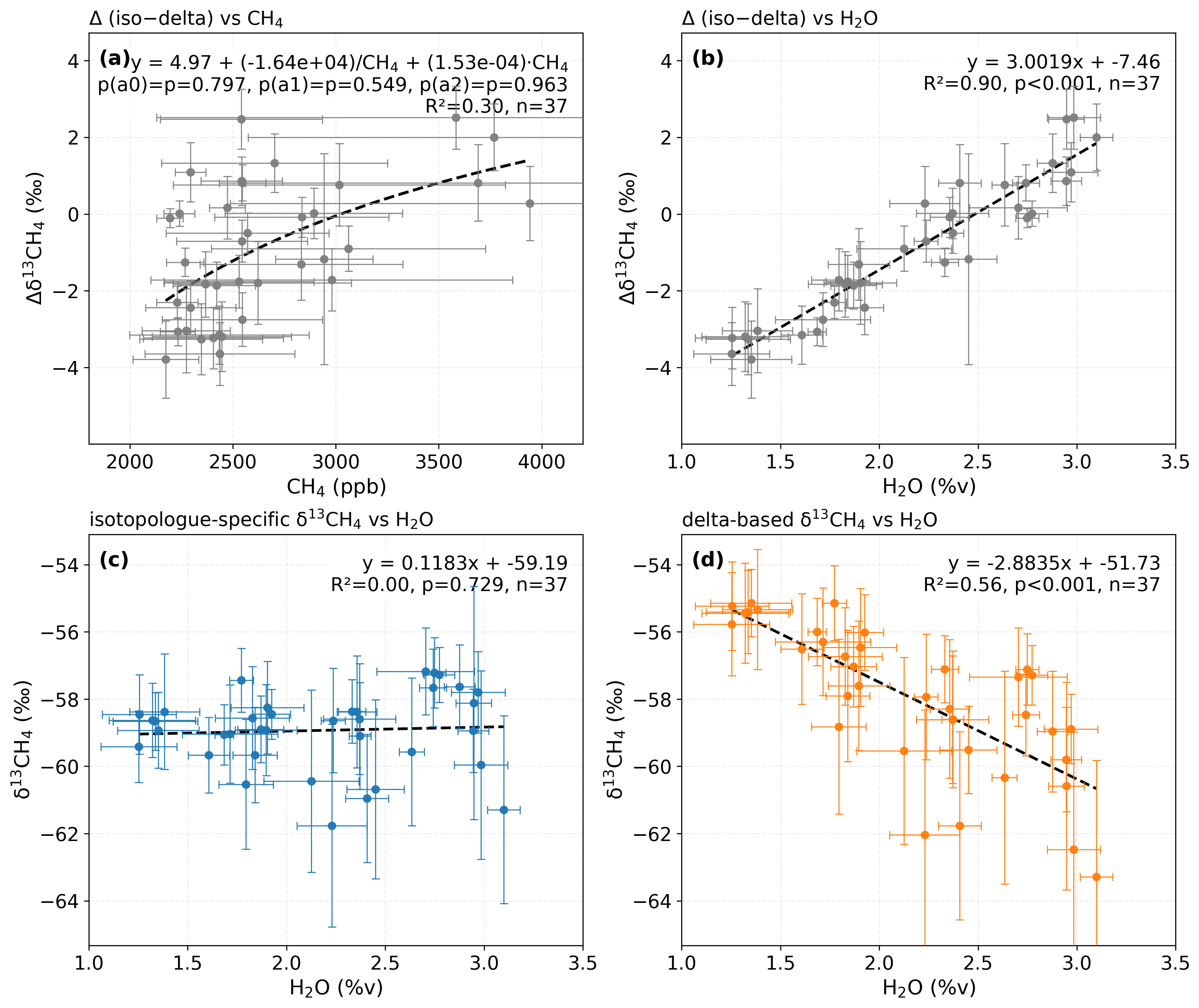 Figure A1Correlations between δ13CH4 calibration results and CH4 and H2O for humid air observations at the Jurong site. Relationship between (a) Δδ13CH4 and CH4; (b) Δδ13CH4 and H2O; (c) isotopologue-specific δ13CH4 and H2O; (d) delta-based δ13CH4 and H2O. Dashed lines indicate fitted regressions. The fitted equations, R2, p, and n are reported in each panel.
