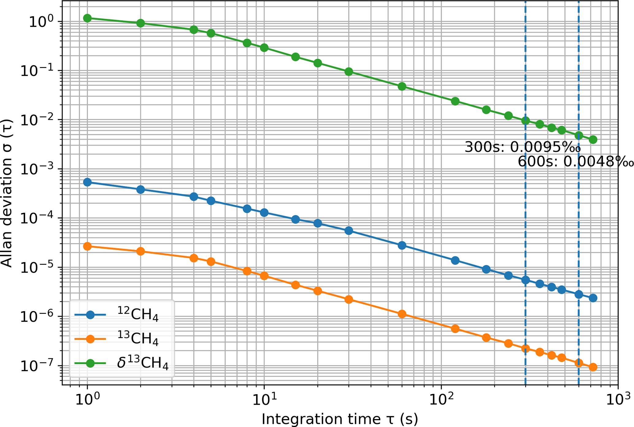 Reference gases were measured in the laboratory and at both field sites to evaluate the performance of the calibration strategies and to ensure consistency of ambient air measurements (Fig. 1b–c). In the laboratory, three reference gases (Ref1–Ref3) were analyzed for 30 min each, while at the Jurong and SORPES sites, three (WS1–WS3) and two (WS4–WS5) reference gases were measured, respectively. Each field measurement lasted 10 min, and the final 5 min were averaged for analysis. This window was chosen to avoid stabilization effects immediately after valve switching and to represent the stable plateau of each injection. The Allan deviation of δ13CH4 (raw) decreases monotonically over the accessible τ range, with σ (300 s) = 0.0095 ‰ and σ (600 s) = 0.0048 ‰ (Fig. A2), and no drift-dominated upturn is observed within this range. Although 600 s yields lower random noise, we retain 5-min averaging as a practical compromise that already provides very low short-term noise while improving operational efficiency and reducing the consumption of both reference and working-standard gases. At Jurong, where no drying was applied, reference gases became humidified in the sampling lines; these values were first corrected for H2O interference before calibration. A detailed description of all reference gases is given in Table 1.
