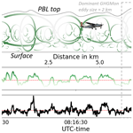 Turbulent motion can lead to a non-zero transport of quantities such as GHGs or particles, even if the mean flow, meaning the mean wind speed, is zero. If the mean vertical wind speed, w=0, and horizontal advection as well as storage are negligible, the fluctuations in the vertical part of the flow dominates and this turbulent eddy transport can be measured to quantify exchange processes between the earth's surface and the PBL (Stull1988). The flux of a scalar quantity c (for example T, H2O or GHGs) is then computed as: