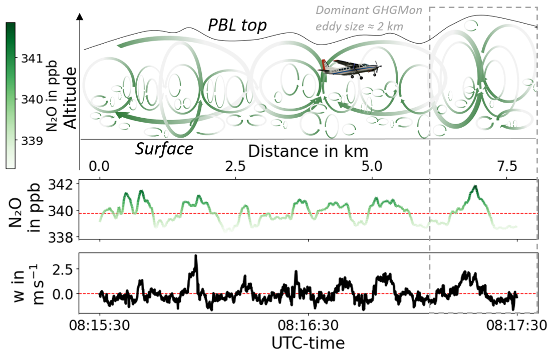 Figure 1Schematics of EC measurements. The sketch in the top visualizes eddies of different sizes, building the turbulent boundary layer. Enhanced concentrations from surface emissions (greenish) are transported upwards in updrafts, lower concentrations (grayish-white) coincide with sinking air parcels. The aircraft-based EC system must cover all relevant contributions from different sized eddies. The lower subplots show N2O and w time series (≈2 min) from the morning flight on 21 June 2023. Means are marked as red dashed lines. The Pearson coefficient R2 between N2O and w for this flux leg is 0.46. The eddies contributing most to the flux had typical scale-sizes of ≈2 km for the GHGMon flights.
