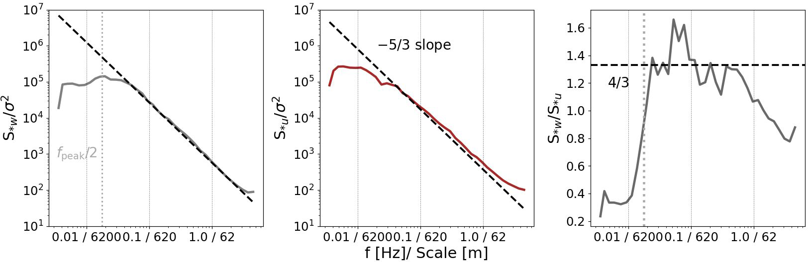 Figure 2Averaged power spectra, S* normalized by variance (σ2) for w and u wind components on 14 June 2023. The black dashed lines in the first two subplots indicate the -5/3 slope, expected in the inertial subrange. The grey dotted vertical line in the first plot marks the fpeak/2 frequency. The third panel shows the ratio S*w/S*u, which approaches the theoretical isotropy value of 4/3 for turbulence in the inertial subrange for frequencies larger than fpeak/2. For clearer presentation, spectra were bin-averaged with 0.2 Hz. Note the ticks on the abscissa are either frequency or scale size, separated by a slash symbol.