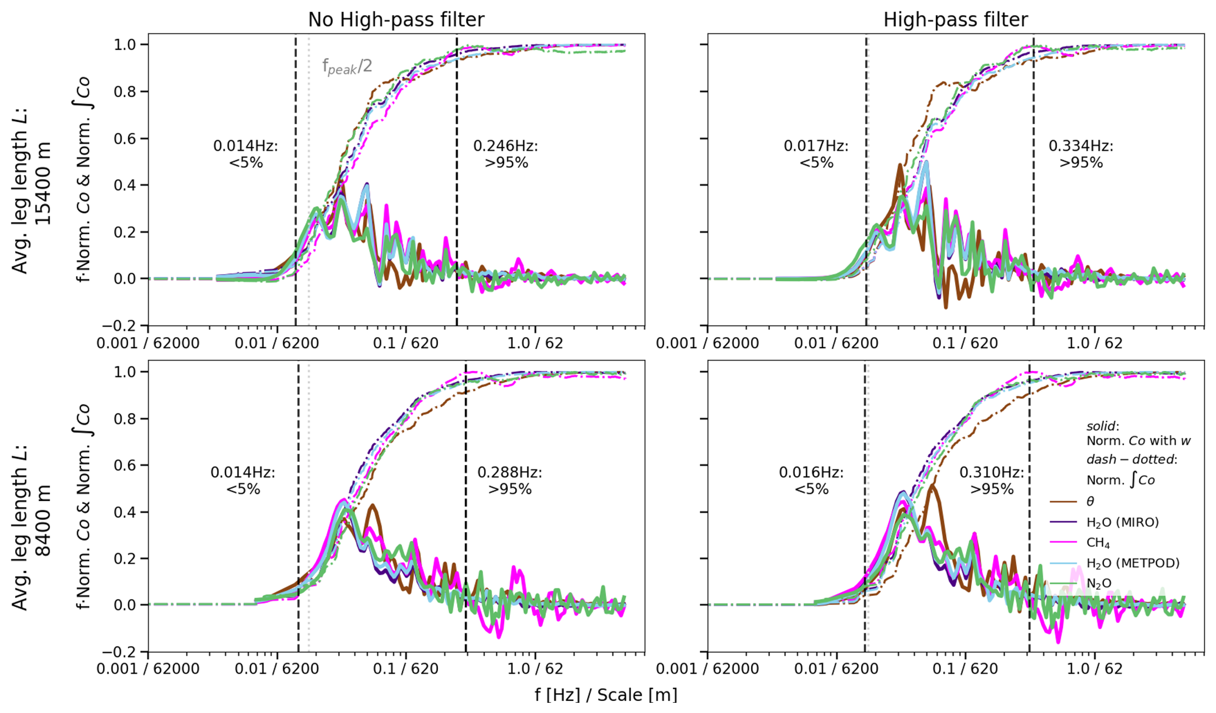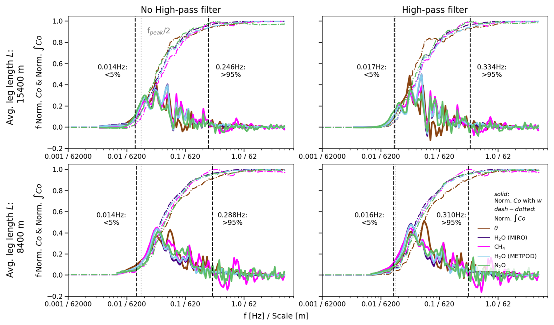 Figure 4Cospectra for the flight on 14 June 2023. The top row shows frequency-multiplied, normalized flight-averaged cospectra of N2O, CH4, θ, and H2O of the GHG analyzer and METPOD with the vertical wind w in 25-fold exaggeration for L=15 400 m. Dash-dotted lines are corresponding to normalized cumulative cospectra (ogives) and the vertical black dashed lines mark the average frequency across all species, at which 5 % and 95 % of the flux is reached. The bottom row shows the same for short flux legs L=8400 m. The left column shows unfiltered data, the right column data which are high-pass filtered with a cut-off at fpeak/2. fpeak/2 is marked as vertical grey dotted line. Note the ticks on the abscissa are either frequency or scale size, separated by a slash symbol.