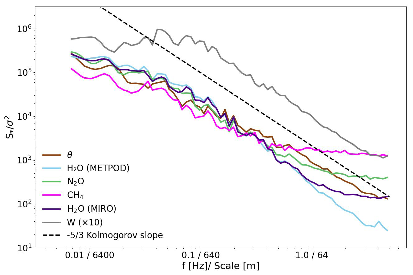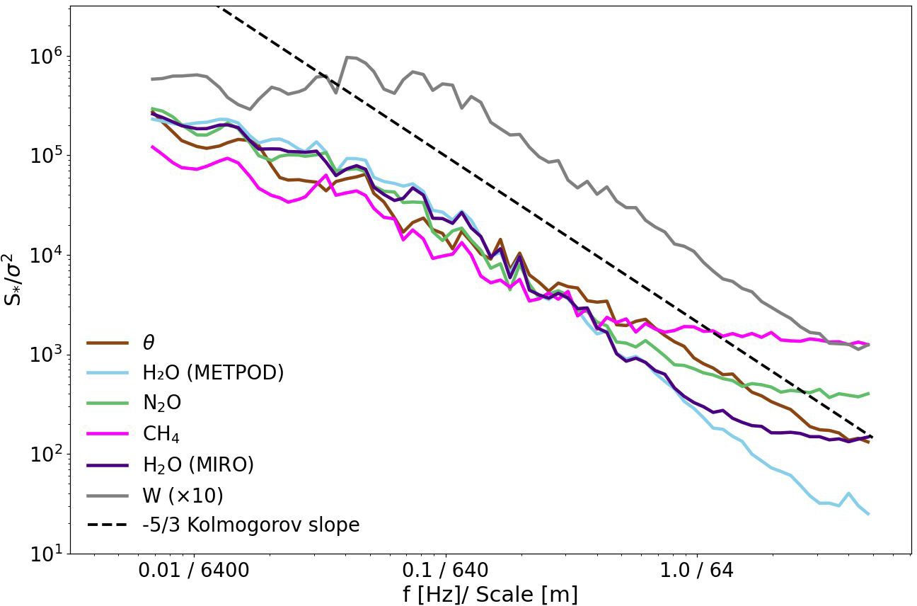 Figure 5Spectral analysis of the flight on 14 June 2023. Frequency multiplied, variance normalized flight average power spectral densities of N2O, CH4, θ, w and H2O of both instruments, the GHG analyzer and METPOD are shown. S*w is shifted upward by an order of magnitude. For comparison, the -5/3 Kolmogorov slope is depicted as dotted black line. Note the ticks on the abscissa are either frequency or scale size, separated by a slash symbol.
