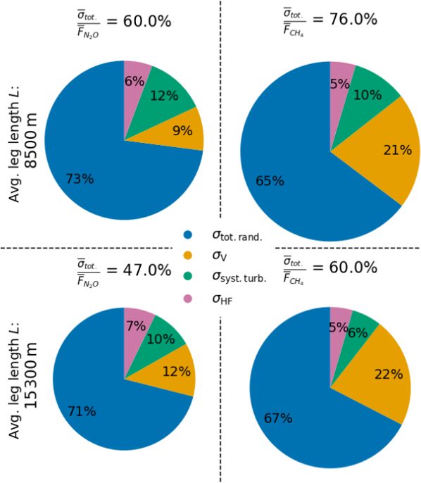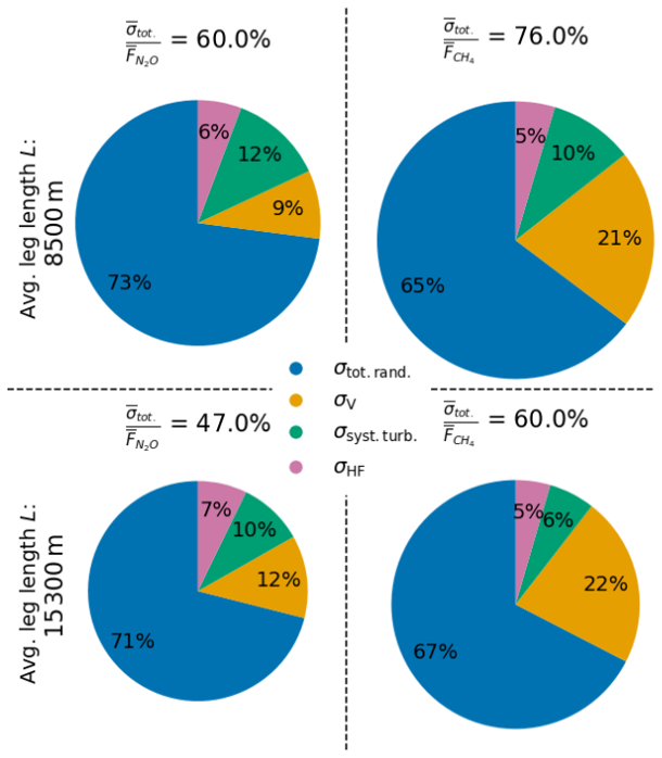Figure 6 illustrates the relative contributions of different uncertainty sources for both short and long leg lengths. The pie charts represent averages over the four flights shown in Fig. 3 and listed in Table 1. Total uncertainties, expressed as the ratio of average total error to mean flux σtot.F are 60 % for N2O and 76 % for CH4 when using short flux legs (L=8500 m). These values decrease to 47 % and 60 %, respectively, for longer flux legs (L=15 300 m). In all cases, random error (σtot.rand.) is the dominant contributor, accounting for approximately 70 % of the total uncertainty for both trace gases and across flux leg lengths. This term includes, besides decorrelations caused by natural inhomogeneities, uncertainties related to the limited precisions of the instruments, but also possible artificial decorrelations between vertical wind and trace species, caused by small imperfections in the water vapor correction. Reducing this component would be feasible through the use of higher-precision instrumentation, both the GHG analyzer and the five-hole probe, as well as by targeting more homogeneous emission sources. Of these two options, the former will be feasible with future progress in GHG analyzer hardware, better spectral fitting algorithms, and improvements of the five-hole probe. We notice that instrumental noise contributions from the GHG analyzer are approximately five to six times larger than those from the vertical wind measurements in the case of N2O, and approximately two to three times larger for the CH4 flux error (averaged across all four flights). The second contribution to σtot.rand. depends on the emission flux itself. While thoughtful selection of flux leg positions and lengths to better fit spatial characteristics can slightly reduce uncertainty, this only holds as long as fundamental EC requirements are not violated (e.g., by excluding large-scale contributions through overly short flux legs). Source heterogeneity, instationarity and turbulence intensity impose a natural lower limit on the lowest achievable uncertainty in airborne EC flux measurements. The systematic turbulence error, σsyst.turb., scales inversely with L, and thus decreases for longer averaging periods. In contrast, the relative contributions of the uncertainties caused by the vertical flux divergence correction, σV, and by the high frequency loss, σHF, increase with L, as they are independent of L. σHF could be reduced by increasing the sample turnover rate in the analyzer's cavity. Balancing high spatial resolution against low flux uncertainties requires consideration of the overarching research objectives. Besides deploying more precise instruments, additional uncertainty reduction could be achieved through repeated and more extensive vertical flux divergence experiments, including more repetitions across a greater number of altitudes. Continuous wavelet transform analysis holds the potential to overcome the trade-off between spatial resolution and uncertainty (Vaughan et al.2021; Wolfe et al.2018; Metzger et al.2013), but its application is outside the scope of this study, as its implementation requires careful methodological choices and interpretation, while the classical EC approach provides a well-established and reliable framework for this first demonstration of our system.