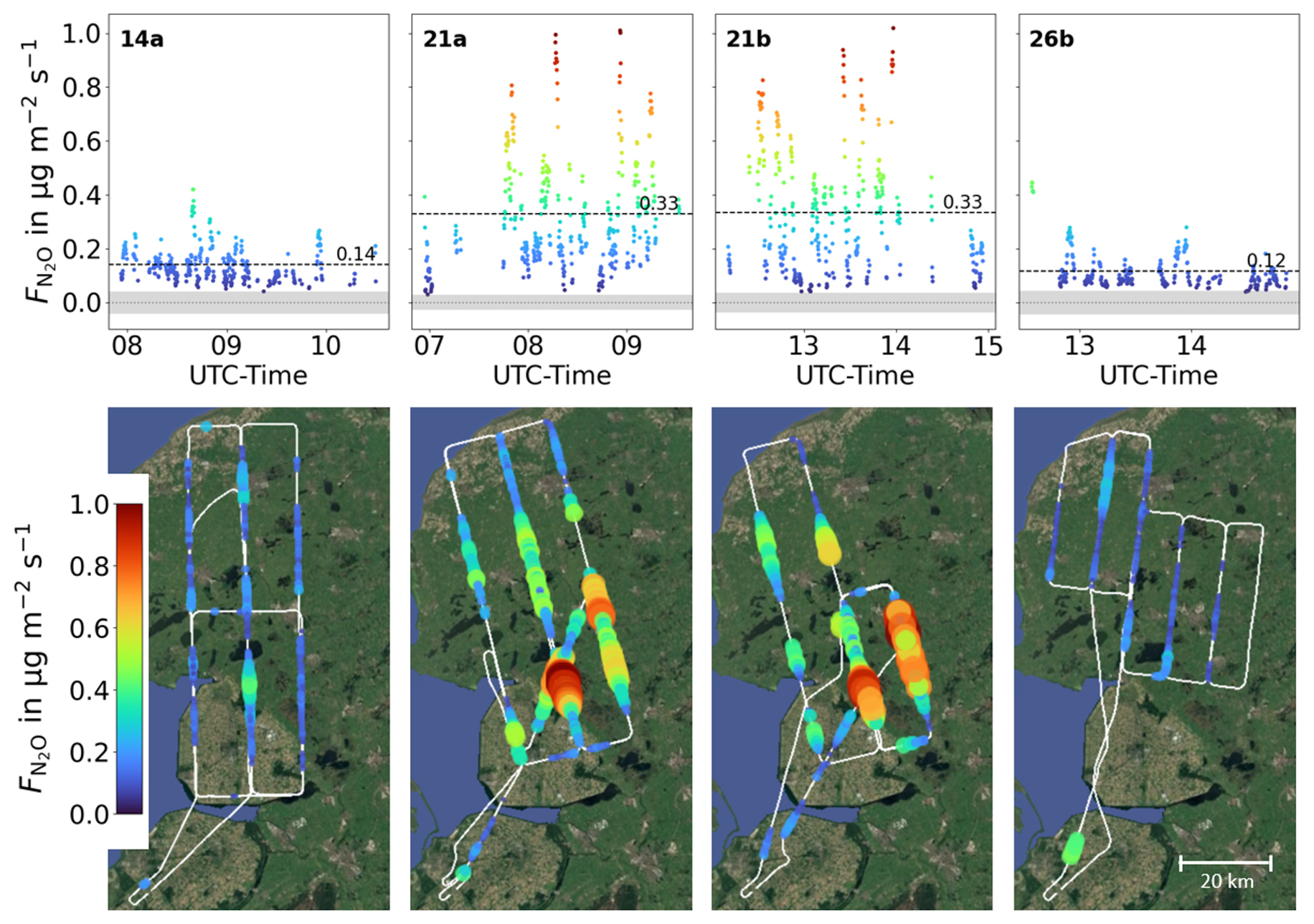 Figure 7 shows N2O fluxes (L=7600 m, 10 s leg to leg shift) for the four Friesland flights (see Table 1) plotted as time-series and corresponding locations plotted on a map.