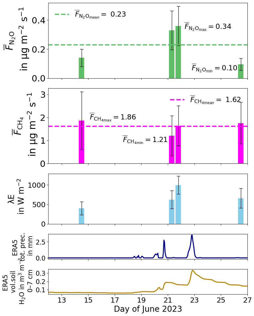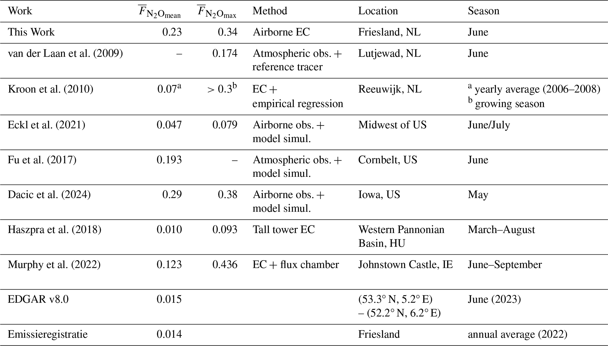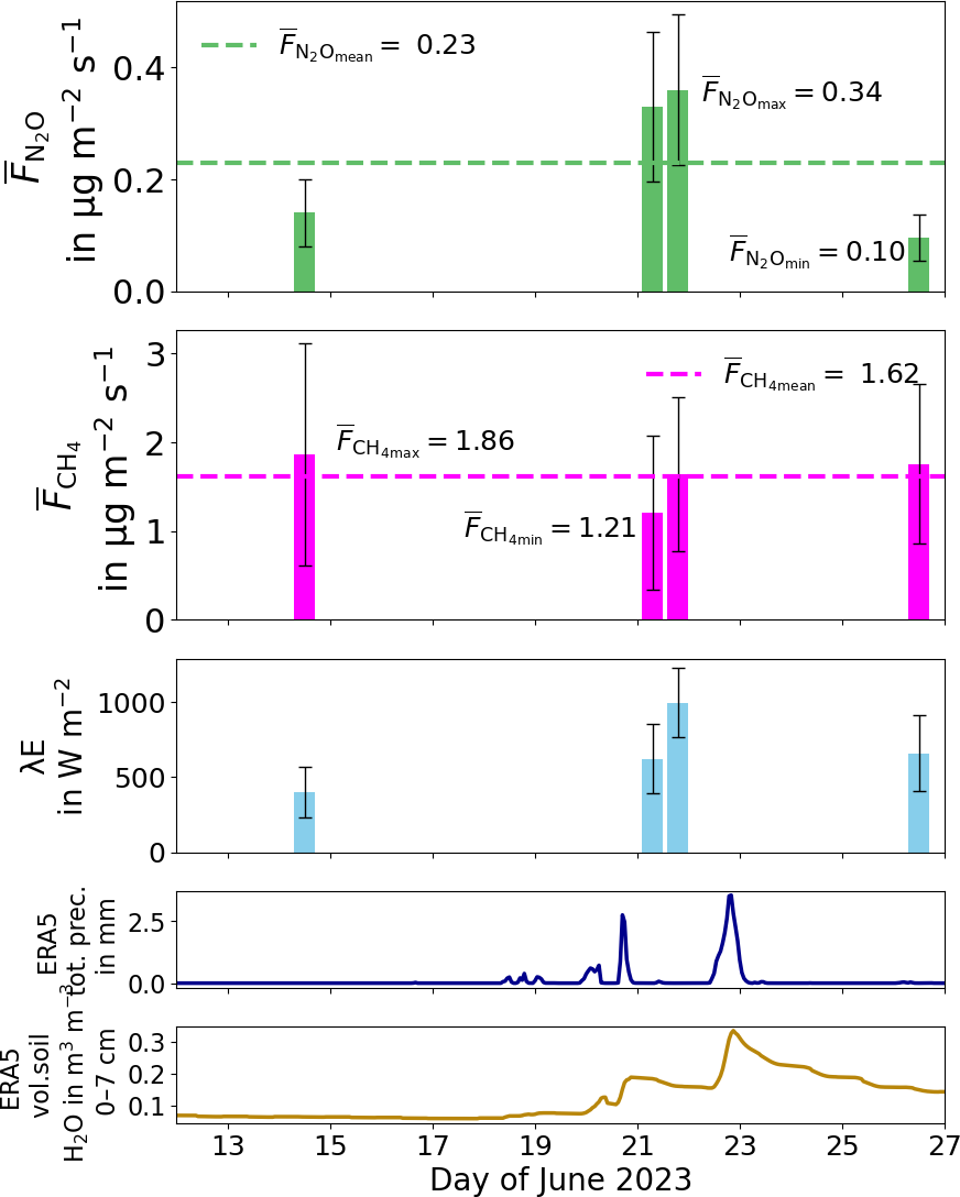 Figure 8 shows flight-averaged N2O and CH4 fluxes for the four GHGMon flights analyzed in this study. Measured N2O fluxes were notably higher during the two flights on 21 June 2023, as already shown in Fig. 7, compared to lower values on 14 and 26 June. The difference between the highest and lowest N2O fluxes spans a factor of approximately three. Peak N2O emissions coincide with elevated flight averaged λE of close to 1000 W m−2. In contrast, CH4 fluxes showed less variation between flights (1.21–1.86 µg m−2 s−1) and did not peak on 21 June. There was no significant precipitation throughout the first half of June 2023, implying a low volumetric soil water content, as evident by ERA5 reanalysis data (Copernicus Climate Change Service2023; Hersbach et al.2020). A frontal system accompanied by thunderstorms passed over Friesland on the evening of 20 June 2023, leading to intense precipitation and elevated soil moisture. During the subsequent research flights on 21 June 2023, hot (25 °C) and sunny weather with scattered cumulus clouds prevailed. These conditions, high surface temperatures, strong solar heating, and wet soils, favor elevated λE. Furthermore, it is known that intense precipitation events and dry-wet transitions are typical hot-moment scenarios, leading to peak N2O emissions (Anthony and Silver2021; Butterbach-Bahl et al.2013). Our observations of peak N2O emissions during the post-precipitation period strongly support this phenomenon. Eckl et al. (2021) made similar observations, with largest N2O fluxes measured after a flooding event in the US Midwest. Both regions, the US Midwest and Friesland, are characterized by intense agricultural activities, including the use of manure and synthetic fertilizer (Miller et al.2012; Van Der Heide et al.2011), which are key contributors to N2O emissions (Stehfest and Bouwman2006). Therefore, our findings of enhanced N2O fluxes during dry-wet transitions in agriculturally dominated regions like Friesland are also consistent with prior studies. Fluxes measured on 26 June are comparable to those during the low soil moisture conditions on 14 June, even though soil water content was as high as during 21 June with the hot-moment emissions (see Fig. 8). This finding gives additional evidence, that N2O emissions peak during changing soil water content, not necessarily during periods of high soil water content (Barrat et al.2021; Harris et al.2021; Butterbach-Bahl et al.2013). In contrast, the relatively stable CH4 fluxes indicate a source less sensitive to short-term meteorological changes, likely enteric fermentation from ruminants. This interpretation is supported by isotopic measurements from JAS flask samples collected during the four flights, which revealed a δ13C(CH4) isotopic signature of -61.2±2.3 ‰, closely matching the -60.8±0.2 ‰ signature reported by Röckmann et al. (2016) for agricultural, ruminant-dominated emissions at the Cabauw tall tower near Utrecht, Netherlands. BU emission estimates of Emissieregistratie also show, that the majority of CH4 emissions in Friesland is produced by ruminants. A deeper interpretation of the flux observations and a spatially resolved comparison with available BU inventories will follow in future work. The results from the four example flights demonstrate that our EC data can be used to enhance understanding and quantification of agricultural GHG emissions across multiple scales: from regional inventory comparison like Eckl et al. (2021), van der Laan et al. (2009) or Fu et al. (2017), and evaluation of process-based models e.g. Ma et al. (2024) or Zhang et al. (2017), to the identification of small-scale emission hotspots (see Fig. 7). Furthermore, our results of spatially confined emissions hotspots, as well as hot-moment emissions of N2O, with differences by a factor of three within days on the regional-scale, demonstrate the importance of spatially and temporally comprehensive observations. Future work will include a more detailed investigation of external emission drivers, ideally combined with supporting information like activity data or ground-based observations, as done in van der Poel et al. (2025) for CO2.