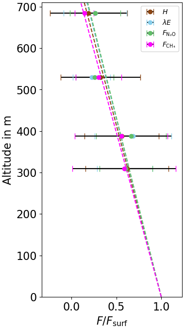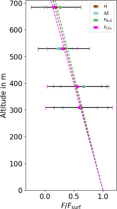 When using EC fluxes for surface emission mapping or inventory comparisons, in situ fluxes, measured at a certain altitude zmeas, must be scaled to represent surface fluxes. GHG fluxes are primarily driven by surface processes, but this influence diminishes with altitude. At the top of the PBL, fluxes are largely controlled by exchange processes between the PBL and the free troposphere in the entrainment zone. As a result, fluxes can approach zero when concentrations gradients between PBL and free atmosphere are minimal or, may even change sign at or just below zi, the boundary layer height. For example, the sensible heat flux, H, can become negative in the presence of temperature inversions, and GHG-fluxes may reverse if the concentration in the free atmosphere is elevated through long-range transport (Gioli et al.2004; Vickers and Mahrt1997; Stull1988)). We accounted for this vertical flux divergence by measuring fluxes at different altitudes inside the PBL, and linearly extrapolating them to the surface. Corresponding calculations and related uncertainties can be found in Appendix A. Footprint calculations are necessary to accurately assign localized flux measurements (at the position of the aircraft) to corresponding source areas on the surface. Kljun et al. (2004) provides a 1-D parameterization technique to estimate the footprint extent considering the along wind dispersion, whereas Metzger et al. (2012) expanded this model by a Gaussian modeled cross-wind contribution function, to get an estimate of the 2-D footprint area. Both models were applied in different studies, including airborne EC (Vaughan et al.2021, 2017; Metzger et al.2012). Additionally, there are simple approximations of the half-width footprint size, used by Wolfe et al. (2018) or Karl et al. (2013), which is defined to contain 50 % of the measured flux: