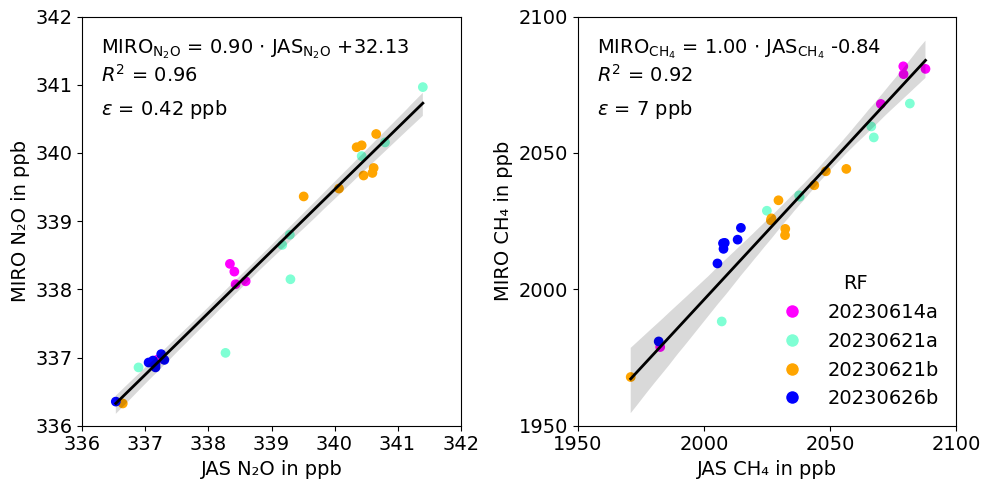 Before the campaign we performed laboratory tests with reference gas to investigate the performance of the analyzer. 10 Hz data of reference gas measurement exhibit a 1σ precision of 4.3 ppb for CH4 and 0.15 ppb for N2O, which further improves to 1.5 and 0.05 ppb, respectively, for resampled 1 Hz data. The manufacturer reports similar specifications for the analyzer. The instrument provides particularly high precision for N2O, outperforming other airborne systems (Kostinek et al.2019; Wilkerson et al.2019; Santoni et al.2014), making it well-suited for EC measurements. During several laboratory tests, we observed a linear drift in most cases, which was of different direction but never exceeded 5.3 ppb h−1 for CH4 and 0.2 ppb h−1 for N2O. Due to the linear nature of the trend, it can be effectively removed through linear detrending, minimizing any impact on EC measurements. However, since the data are intended for broader application beyond EC, an in-flight calibration procedure was implemented, with calibration intervals every 10–15 min, to ensure traceability according to recommendations from the World Meteorological Organization (WMO scale X2006A) (Crotwell and Steinbacher2018).