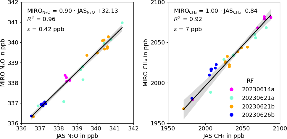 The standard output files of the MIRO analyzer contain mole fractions of N2O, CH4 and CO. Generally, GHG mole fractions are reported in relation to the dry gas molecules to enable unrestricted comparability. Hereby, the dilution effect and quantum mechanical effects related to spectral line broadening have to be considered. Both can alter GHG recordings and are not accounted for in the spectral fitting software of our MIRO MGA3 instrument. Extensive laboratory tests revealed a dependency of the measured GHG mole fractions on H2O levels and were used to elaborate an accurate correction of these effects. Details on the experimental setup, the derivation of the correction curve, and its validation will be presented in a separate publication and are subject of Knez et al. (2024). In Appendix B, the applied water vapor correction is validated by comparing the corrected N2O and CH4 measurements with data from the independent reference instrument JAS (see Sect. 2.2.3). Furthermore, possible inaccuracies of the water vapor correction are accounted for in the EC uncertainty assessment (see Sect. 3.2).