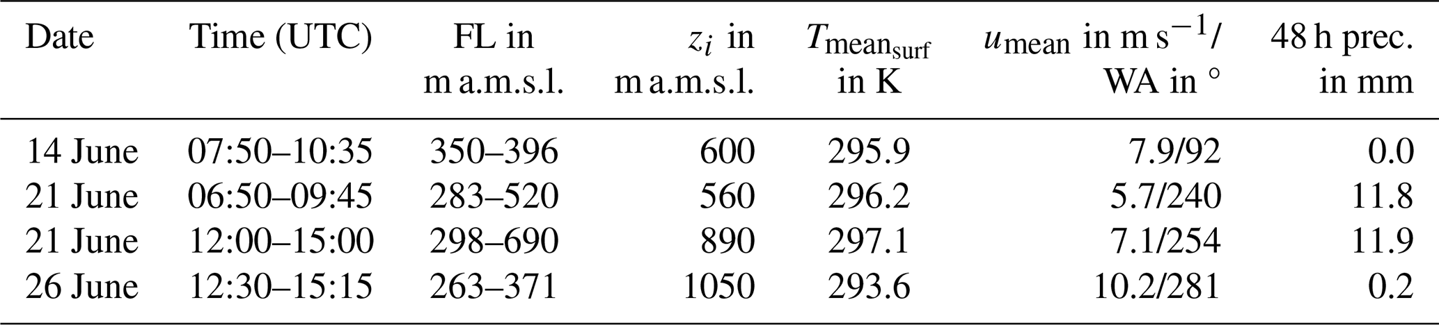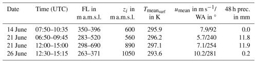 The GHGMon campaign took place from 10 to 30 June 2023, the campaign base was at the Lelystad airport (EHLE), Flevoland, the Netherlands. A total of 14 research flights, usually lasting 2.5–3 h, were carried out, each covering a distance of ≈500–600 km. The average flight speed was ≈62.1 m s−1 and individual flight paths were flown between FL08 (243 m a.m.s.l., due to national flight altitude restrictions) and the top of the planetary boundary layer (PBL). During each flight, at least two vertical profiles were flown to determine the boundary layer height and measure gradients into the free troposphere up to ≈3000 m a.m.s.l. Since the primary focus of the campaign was GHG flux measurement using EC, most flight paths were straight and maintained at a constant altitude. This is important to assure relatively stable flux footprints and to not violate ergodicity with changes in altitude. We flew grid-like patterns with most paths perpendicular to the mean PBL wind direction and some spacing in between, with the aim to cover the entire target area and having high footprint coverage, while still having some footprint overlap between two parallel paths, to assess the consistency of their fluxes. Typical values of the half-width footprint size d0.5 (see Eq. 4) ranged between 1–10 km for the GHGMon flights, therefore we set the spacing between two parallel flight paths to 10–20 km. Some of the paths were repeated to assess temporal flux consistency (see Sect. 4.1) and to study areas of high interest, especially during different meteorological situations. Some paths were varied in altitude to analyze the vertical flux divergence. For this purpose, we chose flight paths over the same area and flew one immediately after the other in order to avoid spatial or temporal flux variations affecting our vertical flux divergence measurements. Well-developed turbulence is a prerequisite for EC, hence flight days were restricted to fair weather conditions with little to no cumulus cloud cover, using meteorological forecast data of zi, cloud cover, wind direction and speed, as well as precipitation (and further parameters) from the European Centre for Medium-Range Weather Forecasts, ECMWF. Flight paths were planned to cover areas of high agricultural activity, based on the Dutch national greenhouse gas emissions inventory Emissieregistratie (Emissieregistratie2025). It provides bottom-up emission estimates of various species with high spatial resolution (5×5 km for GHGs) and is the base for national and international emission reporting. Emissions are estimated based on reportings from industry, statistical data, collected by national institutes and universities (e.g. livestock number or amount of used fertilizer), and in the case of agriculture with the help of the National Emission Model for Agriculture, which uses IPCC conform Tier 13 approaches with partially country specific emission factors. Figure 3c shows agricultural N2O emissions from Emissieregistratie, which account for more than 90 % of N2O emissions in Friesland. Figure 3d displays the paths of four research flights carried out mainly in the province of Friesland, covering the same area under different meteorological conditions. Those results will be discussed in more detail in the following sections to analyse the temporal variability of N2O and CH4 emissions. Table 1 provides additional meteorological and flight-specific information on those four flights. All of them were conducted with the altitude of all EC flight paths well beyond zi, during warm days with moderate to fresh and stable wind conditions. Notable differences in precipitation occurred during the 48 h before the flights, with dry conditions on 14 and 26 June, and wet conditions during the two flights on 21 June.