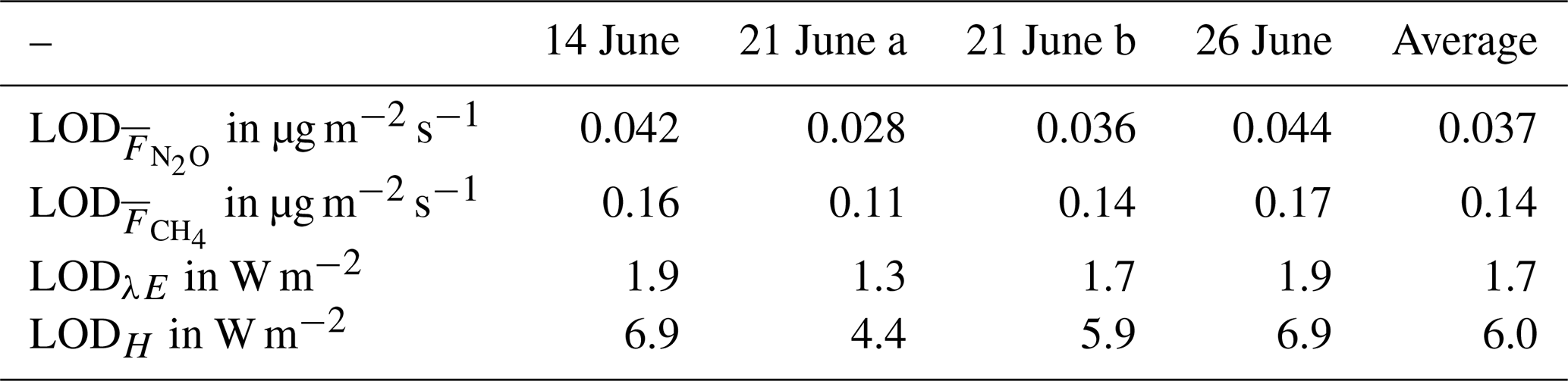 Table 2Flux-LODs for N2O, CH4, λE and H. For each research flight, single flux leg LODs were averaged. The last column is the average of all four flights.