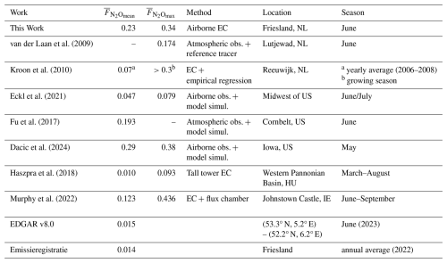 In this section we first demonstrate the ability of our approach to deliver spatially resolved N2O fluxes, as derived along flight paths. We then compare our flux results for repeated flux legs at similar locations to demonstrate that derived emissions are consistent within uncertainties. We further discuss the temporal variability of both N2O and CH4 emissions by presenting the flux results from airborne measurements conducted on different days before and after a rain event. Finally, we compare the N2O emission rates with regional emissions reported in inventories for Friesland and with emissions observed in other agricultural areas worldwide. Please note that the focus in this section is on N2O with only some references to CH4 results, motivated by the lack of airborne studies on agricultural N2O emissions.