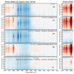 To investigate the effects of the L1 v3.0 updates on the soft calibration, we re-computed its correction spectra for two orbits using customized L1 processing where corrections are switched on and off. The two orbits are chosen in September 2018 and March 2022 to follow the temporal stability of the correction. This analysis is illustrated in Fig. 12, displaying the soft calibration spectra panels of the customized L1 processing for all the across-track positions and a single radiance level.