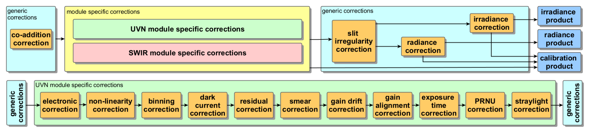 Before launch TROPOMI has been calibrated with respect to known radiometric sources. From these on-ground calibration measurements the calibration key data (CKD) were derived for L1 v1.0 (Kleipool et al.2018). The CKD are input parameters for the correction algorithms applied to the raw instrument data by the L0-1b data processor. The outputs are calibrated geolocated radiance and irradiance data. A high-level overview of the correction algorithms of the L0-1b data processor is shown in Fig. 1, adapted from Kleipool et al. (2018). The light blue blocks in the figure refer to generic corrections addressing instrument-wide effects, e.g co-addition or the radiometric irradiance and radiance response, while the yellow block is the module-specific corrections. The lower diagram shows the UVN-module specific corrections, omitting flagging and annotation corrections. The module-specific corrections include both additive and multiplicative corrections, while the generic ones correct exclusively for multiplicative effects.