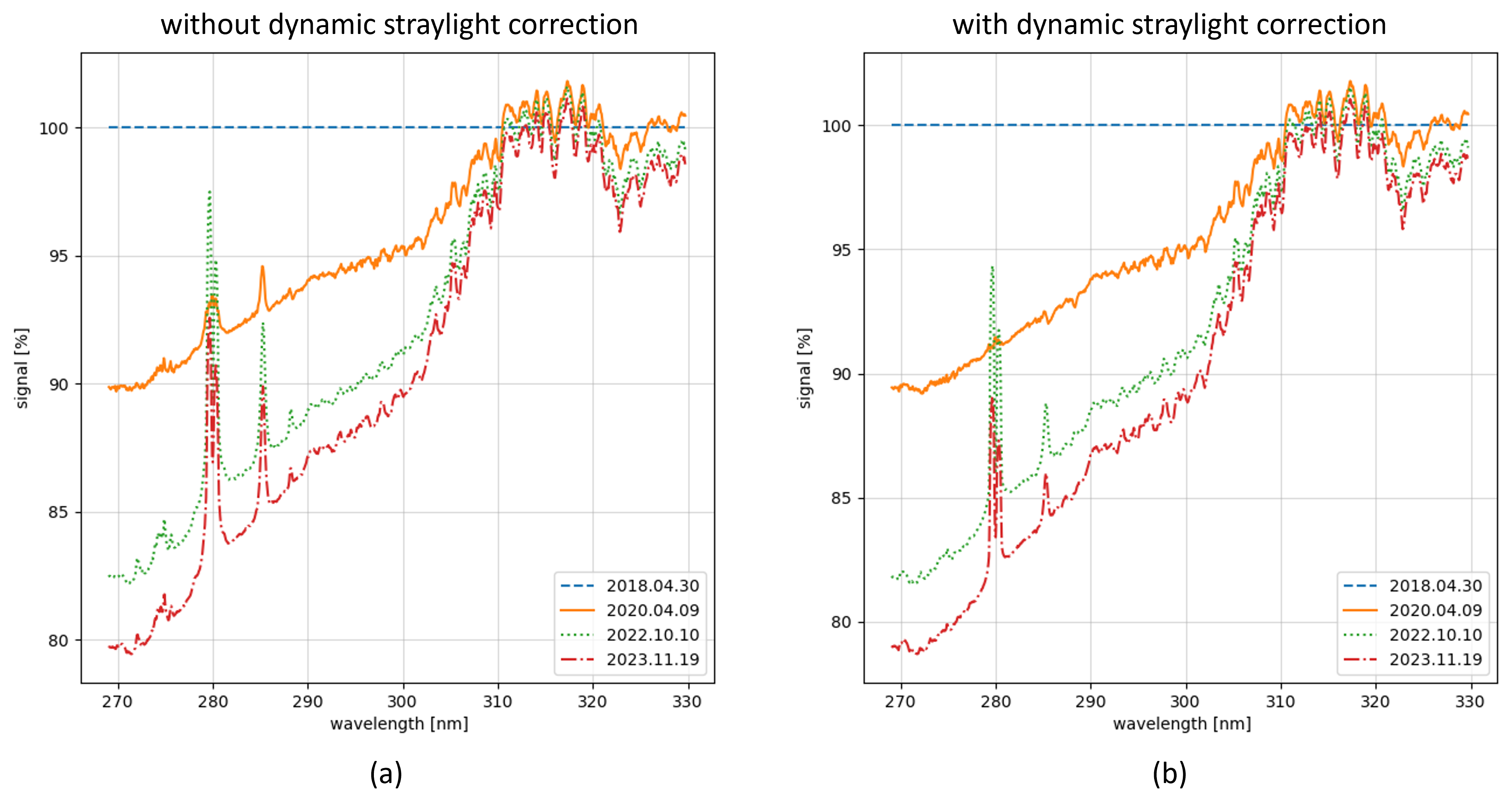 Figure 2UV irradiance measurement signals at the nadir viewing angle for three orbits during the TROPOMI mission, on 9 April 2020 (orange line), on 10 October 2022 (green line), and on 19 November 2023 (red line), relative to the reference orbit 2818 on 30 April 2018 (dashed blue horizontal line). The optical degradation is not smooth in spectral dimension, and around 280 and 286 nm there are peaks appearing which are partly correlated to the signal magnitude in the spectral range 310–320 nm. The spectral features in the 310–320 nm range are attributed to bleaching of the coating, which increases the optical throughput. (a) shows the un-corrected measurements, while in (b) the dynamic straylight correction is applied. The effect of the solar variability is visible in the peaks height reduction of the un-corrected measurements, and in the double peak presence for the data from 2022 (green line).