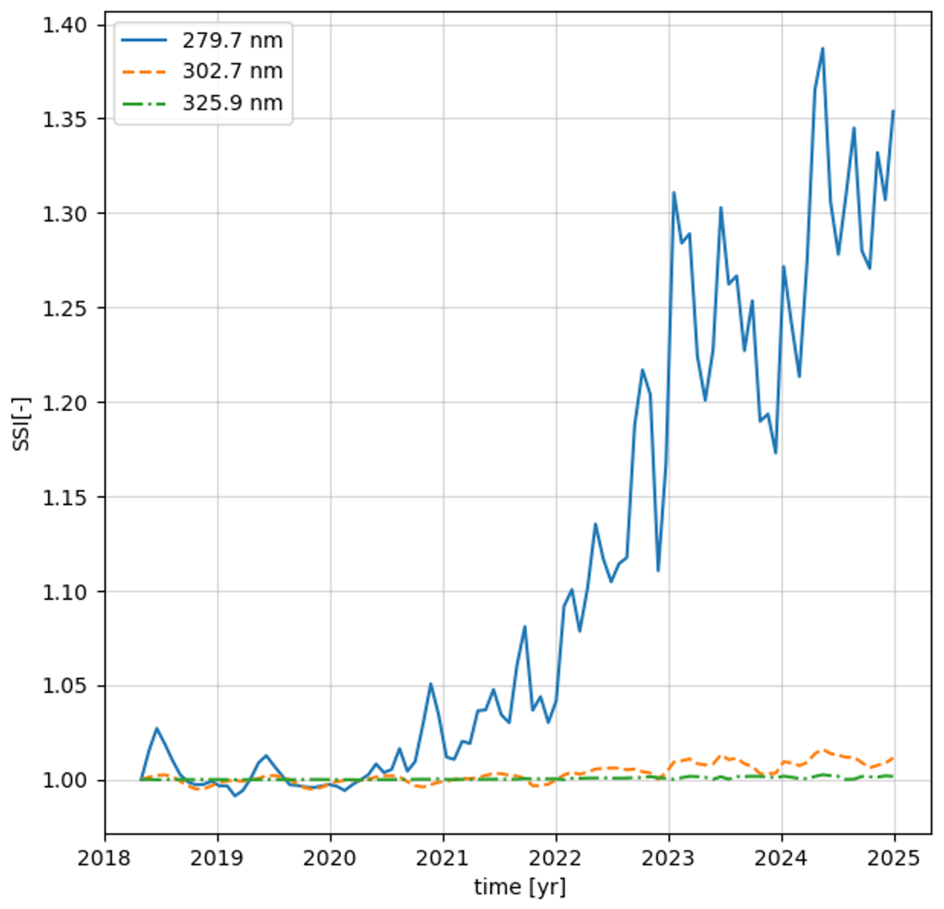 To show the effect of the dynamic straylight correction on the science region of the detector, in Fig. 5a we also compare the solar Mg line index at 280 nm detected with the UV spectrometer and the Ca line index at 393 nm detected with the UVIS spectrometer. With the dynamic straylight correction the correlation between the two TROPOMI spectrometers improves, suggesting a reduction of the additive effects. Comparing the lines derived from TROPOMI measurements with an external reference (Fig. 5b), taken from IUP Bremen (2026), we also see much improved agreement when applying the dynamic straylight correction.