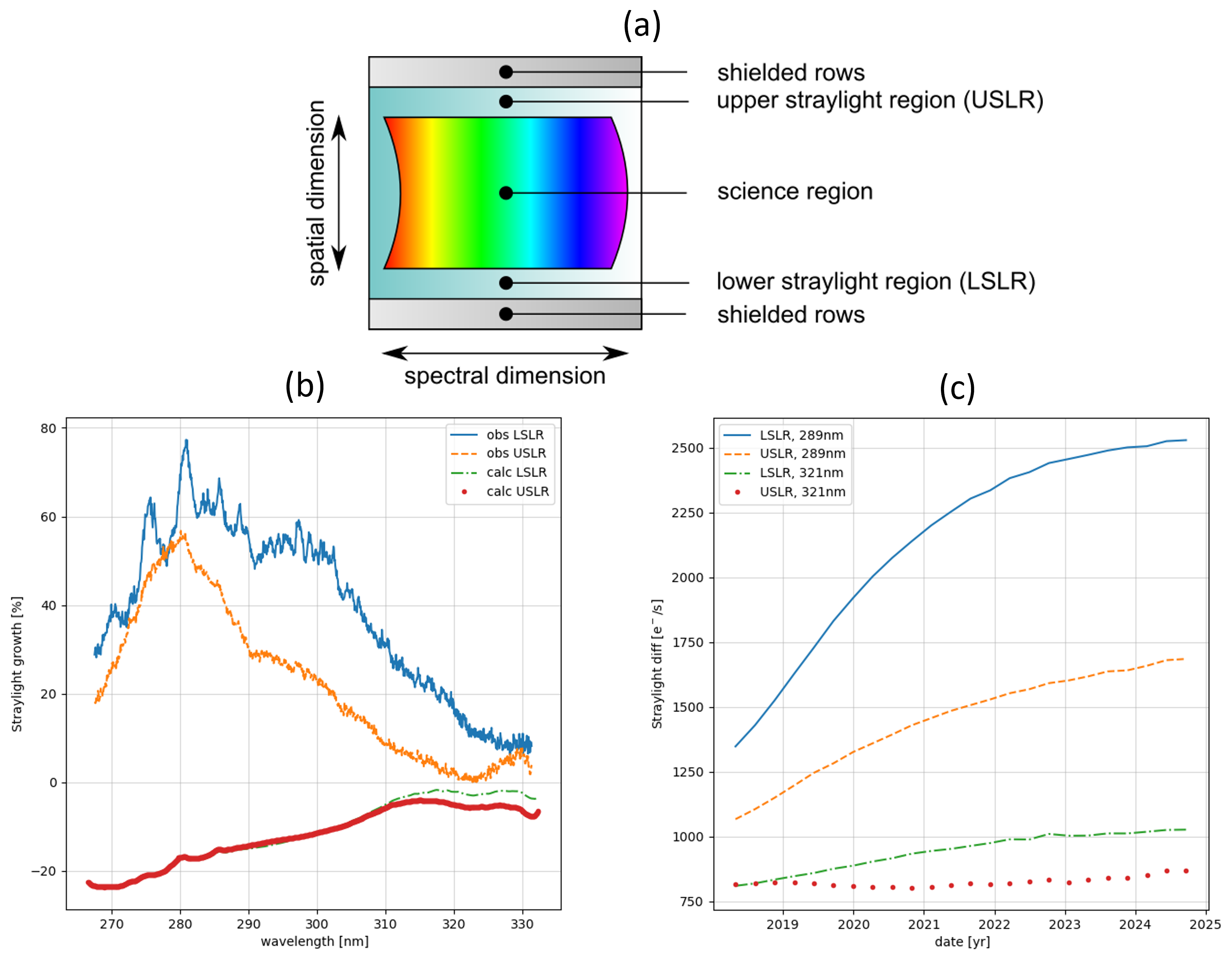 Figure 4(a) Schematic view of the TROPOMI UV detector, showing the position of the USLR and LSLR. (b) Straylight growth for the irradiance since the beginning of the mission (April 2018) until January 2025, observed and computed (using the straylight correction algorithm with the symmetrical kernel shape implemented in the L1 v2.1 data) in the LSLR and USLR. (c) Difference between observed and calculated straylight at two specific wavelengths, at 289 and 321 nm, in both USLR and LSLR.