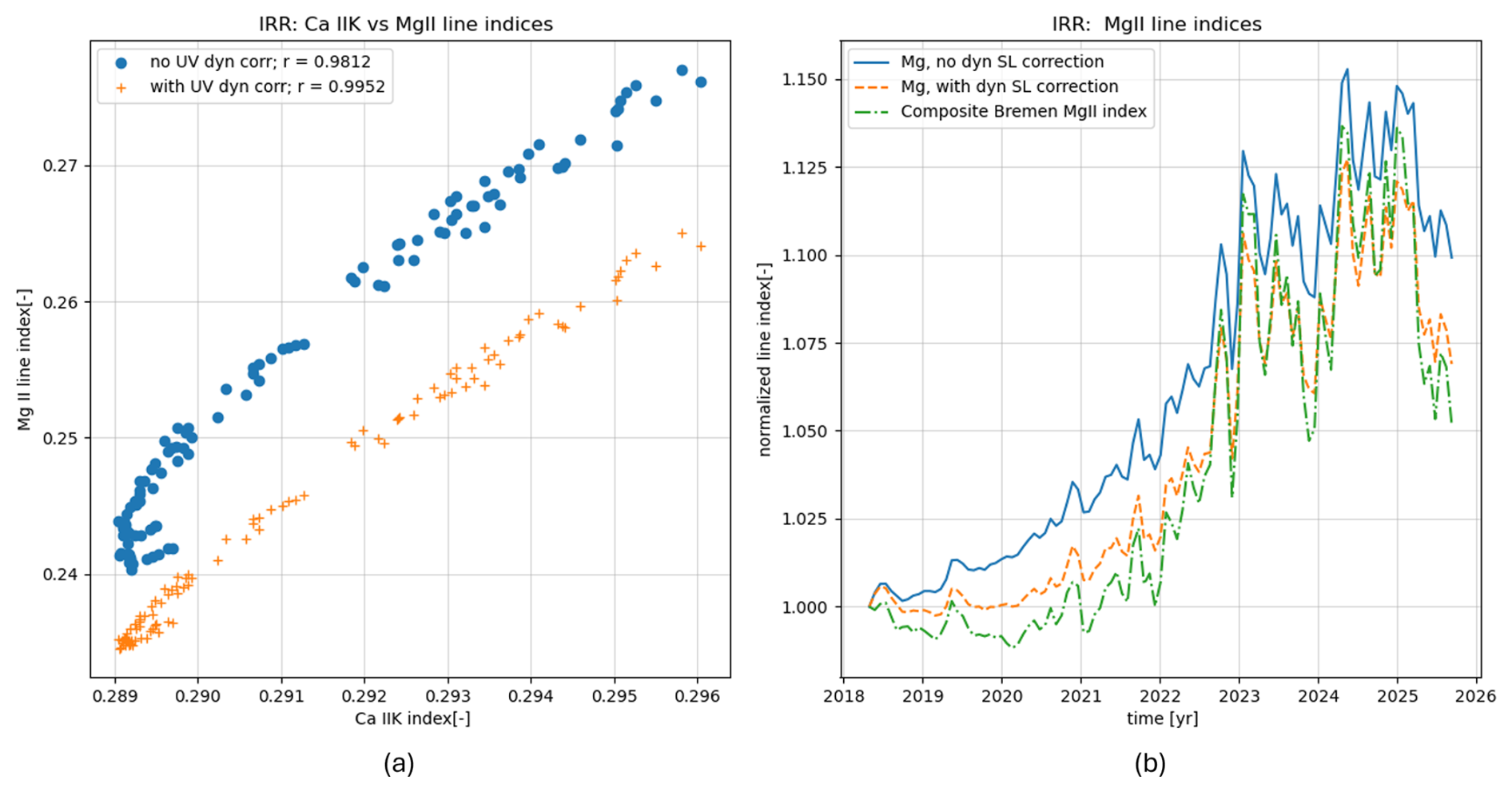 Figure 5Comparison of Mg line indices. (a) Correlation plot of the time series of two line indices: the Mg line index at 280 nm detected with the UV spectrometer, and the Ca line index at 393 nm detected with the UVIS spectrometer. The impact of the dynamic straylight correction on the Mg line index is shown: the correlation between the line indices improves when using the dynamic straylight correction. (b) Comparison of the Mg line index (normalized at April 2018), computed with and without the dynamic straylight correction, with an external data set: the Bremen Composite Magnesium II index (IUP Bremen2026).