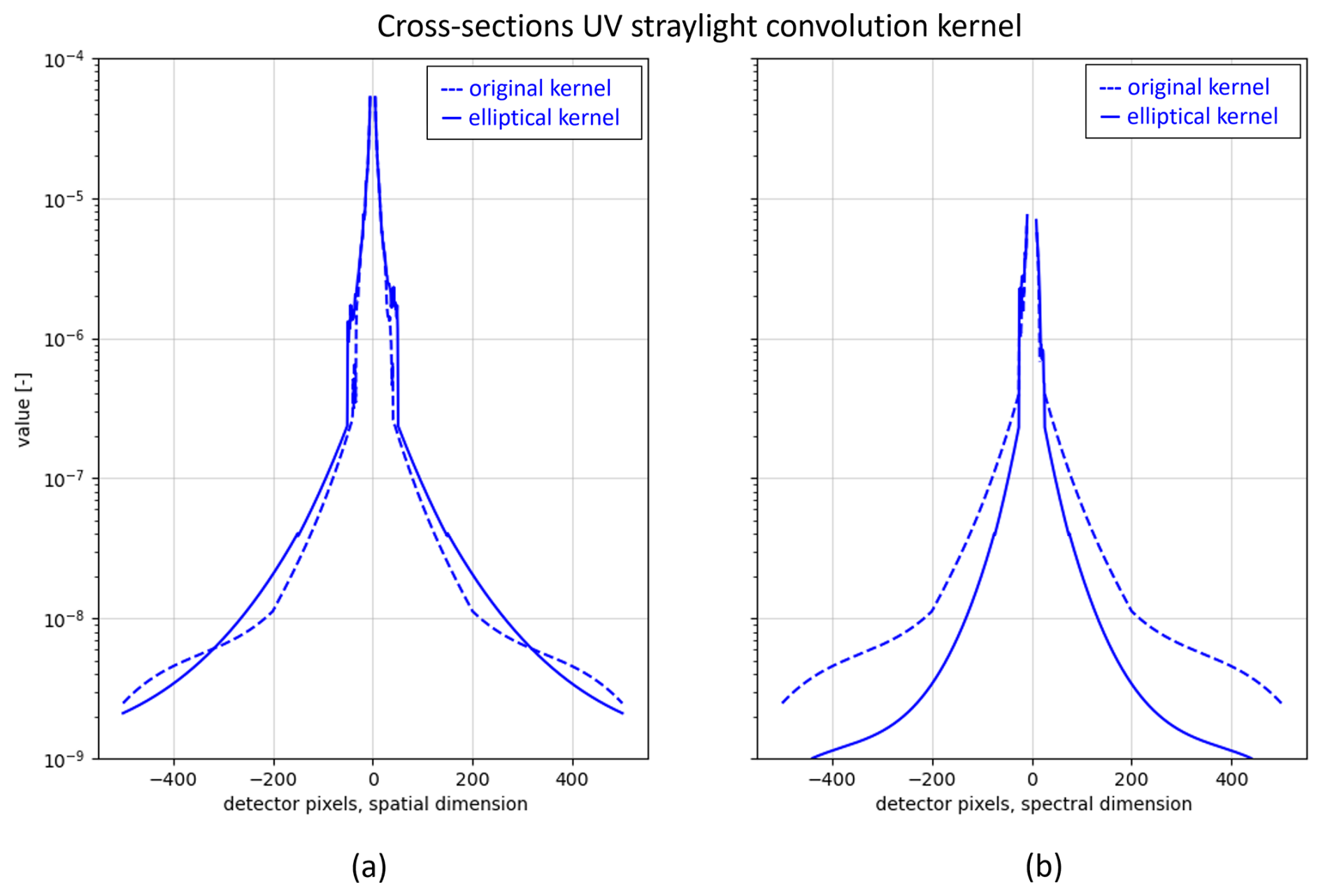Regarding the choice of a different static convolution kernel, we remark that given the limited amount of on-ground measurements, no unique solution exists. The choice of using the elliptical kernel shape over the symmetrical one prevents that the straylight kernel over-corrects the radiance measurements, as shown in Fig. 7. Moreover, with the implementation of the dynamic straylight correction it can be expected that the dynamic calibration improves the final straylight estimate, via the aforementioned communicating vessels mechanism. Although the dynamic straylight correction is based on a linear interpolation of data from the USLR/LSLR, which is not unique and other choices could be made, we have shown that the correction, as implemented, improves also the signal in the science region.