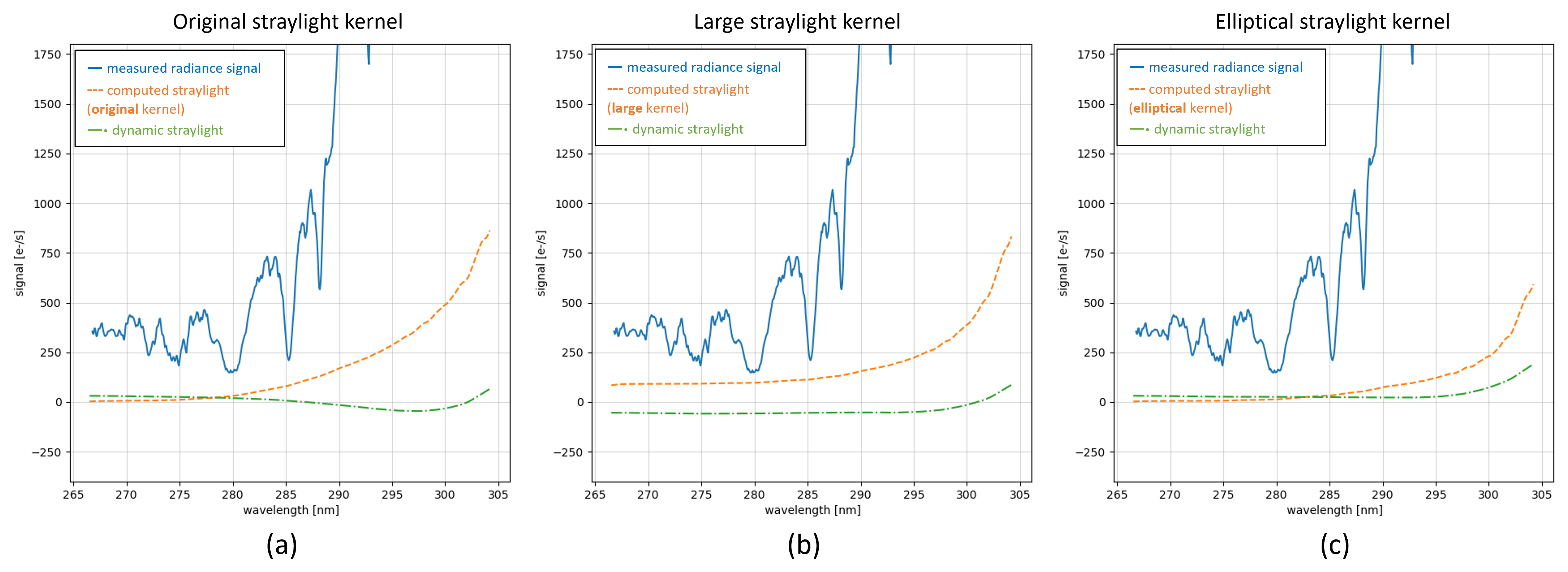 Figure 7Comparison of the original convolution kernel shape (a) and two alternative ones (b, c), derived from the first E2 radiance measurement (orbit 2818, on 30 April 2018), shown as orange dashed lines. The blue lines shows the radiance without any straylight applied. The elliptical kernel shape, shown in (c), illustrates the lowest straylight kernel contribution, but also the smallest dynamic straylight term (green dashed-dotted line), positive in the whole spectral range.