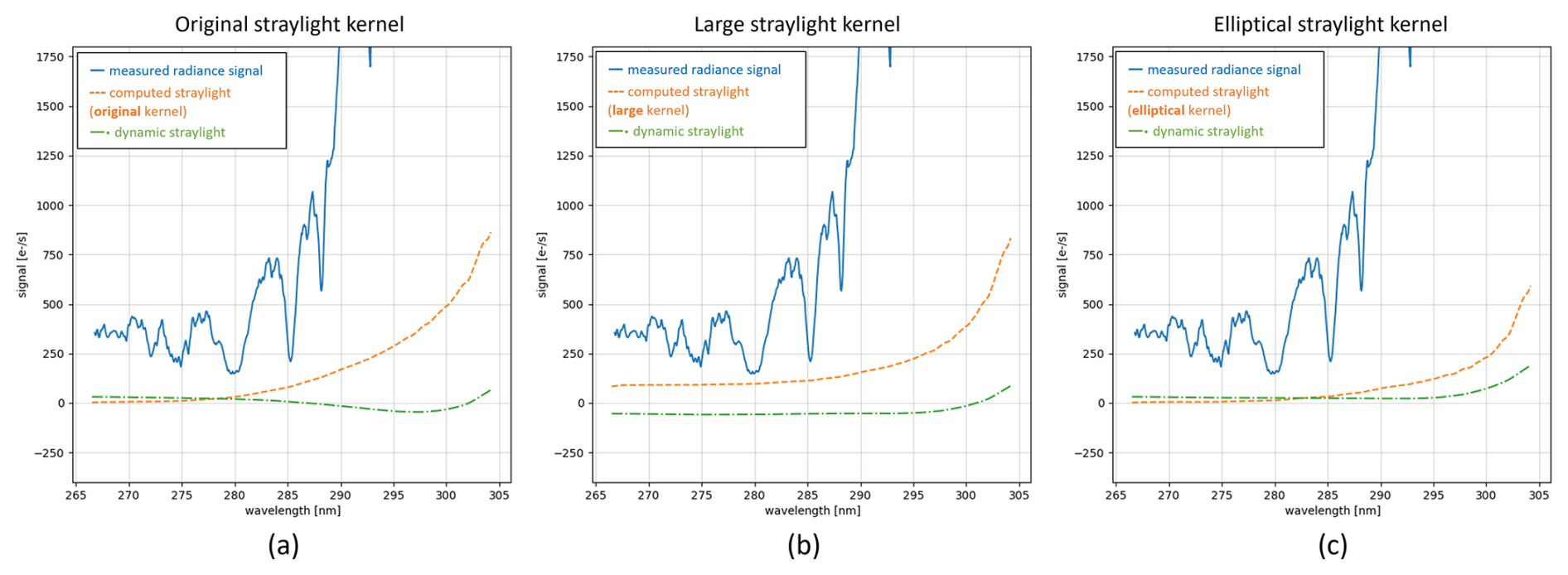 An example showing the effect of using different straylight convolution kernel shapes on the first E2 radiance measurement (orbit 2818, on 30 April 2018) is illustrated in Fig. 7a–c. These measurements represent a challenging situation because of the high ratio in signal magnitude between band 1–2, a much higher ratio than in the irradiance measurements. In these plots, the blue line indicates the radiance measurement processed without any straylight correction; the dashed-dotted green line is the amount calculated by the dynamic straylight correction algorithm, obtained from the difference between the measured and calculated straylight in the USLR/LSLR; the orange line shows the straylight signal calculated using the original kernel shape (in Fig. 7a) and two other alternative shapes: a “large” shape (in Fig. 7b), with increased tails both in the spatial and spectral dimensions, and an elliptical/asymmetric shape (in Fig. 7c), which partly redistributes the straylight signal from the spectral dimension toward the spatial one. These three sub-figures demonstrate the communicating vessels principle in the interaction between the static kernel and the dynamic straylight corrections. In Fig. 7a, we see that the dynamic straylight term is positive below 286 nm, meaning that the original kernel does not remove all the straylight in that region. In the region between 286–302 nm, the dynamic straylight term is negative, which indicates that the convolution kernel is too strong in that spectral region. In Fig. 7b, we note that although the straylight kernel (orange line) has a larger contribution at wavelengths <300 nm, the dynamic straylight term (green line) is negative in almost the whole spectral range, indicating that in this case the large straylight kernel is over-correcting the measured signal. In Fig. 7c, we see that the elliptical kernel shape not only has the lowest straylight kernel contribution over the whole range, but this also results in the smallest and always positive dynamic straylight term. The minimization of the dynamic straylight and the absence of over-correction motivated the choice of the elliptical (Fig. 7c) kernel as an improvement over the original symmetric shape (Fig. 7a). Thus, although the dynamic straylight correction ameliorates unwanted effects such as overcorrection, it is nonetheless worthwhile to start with a good initial choice for the straylight kernel (in this case, the elliptical kernel), as it is demonstrated by the results in Sect. 4.