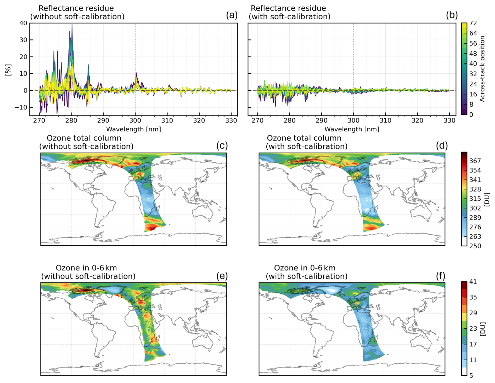 The operational TROPOMI ozone profile algorithm applies a soft calibration correction on the bands 1–2 input spectra before performing the retrieval itself. This correction is an essential complementary step to the L1 calibration of the bands 1–2 spectra in order to obtain good total and tropospheric retrievals. Figure 8 demonstrates how the soft calibration works for improving ozone retrievals, in comparison to the left panels where the soft calibration is tuned off.