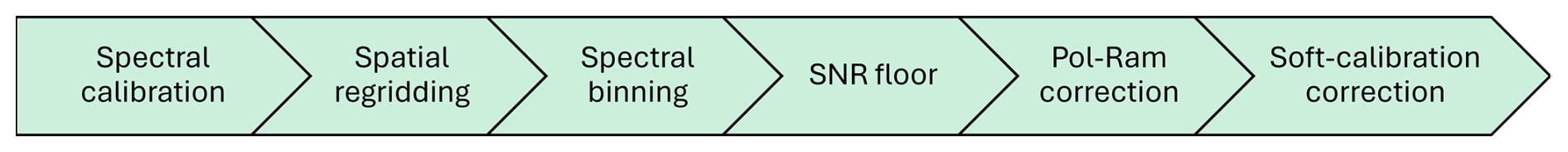 Figure 9The pre-processing correction steps performed on the bands 1–2 spectra before the ozone profile retrieval, which are also applied on the L1 spectra used for the radiance residuals calculation of the soft calibration correction.