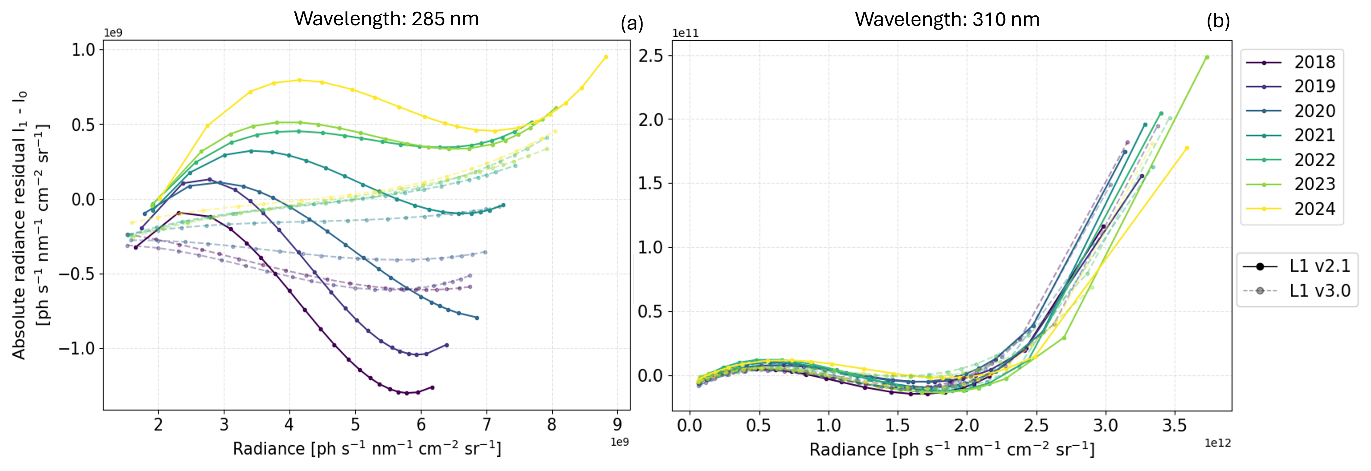 After obtaining the modelled spectra for all the across-track positions of the selected L1 orbits, the absolute residuals (measurement−model) are calculated. In particular, the absolute residuals are first binned into 20 equally populated percentiles bins (each bin covers 5 % of the sorted dataset) based on the radiance, per each across-track position and wavelength. After the binning, a wavelength grid of 1200 points is used to group the residuals, covering the spectral fit range 270–330 nm. Then, the mean radiance, the median and standard deviation residuals are computed at the mid-point of each radiance bin, and a 3rd degree polynomial function is fitted through these mid-percentiles points, to ensure a smooth behavior of the correction as a function of the radiance. A representation of the 2021 soft calibration correction is shown in Fig. B2, for a single across-track position 35 and three wavelengths 285, 300 and 310 nm. An overview of the yearly residuals is the solid lines in shown in Fig. 10 for the same across-track position number 35 and two wavelengths, at 285 and 310 nm. The lines represent the combined absolute spectral radiance residual per each year of the TROPOMI mission, namely the average residual over the differences computed per each single orbit of that year. In band 1, the absolute residuals increase over time, while in band 2 the difference among the years is almost negligible. In the figure, we also see the comparison between the L1 v2.1 absolute residuals (solid lines) with the L1 v3.0. While the effects of the L1 v3.0 updates on the soft calibration correction will be discussed in details in Sect. 4, we can already observe the significant reduction in the absolute residual magnitude in band 1, as well as the residual growth decrease during the mission when using the L1 v3.0 data (Fig. 10a).