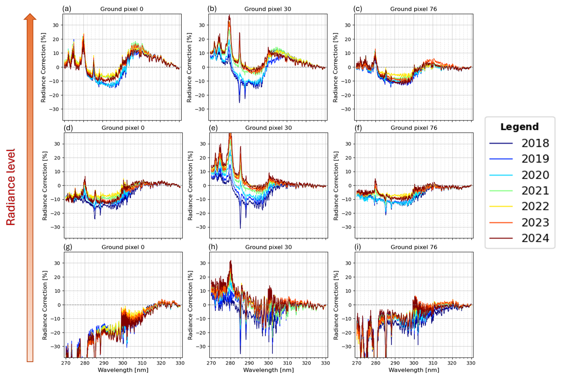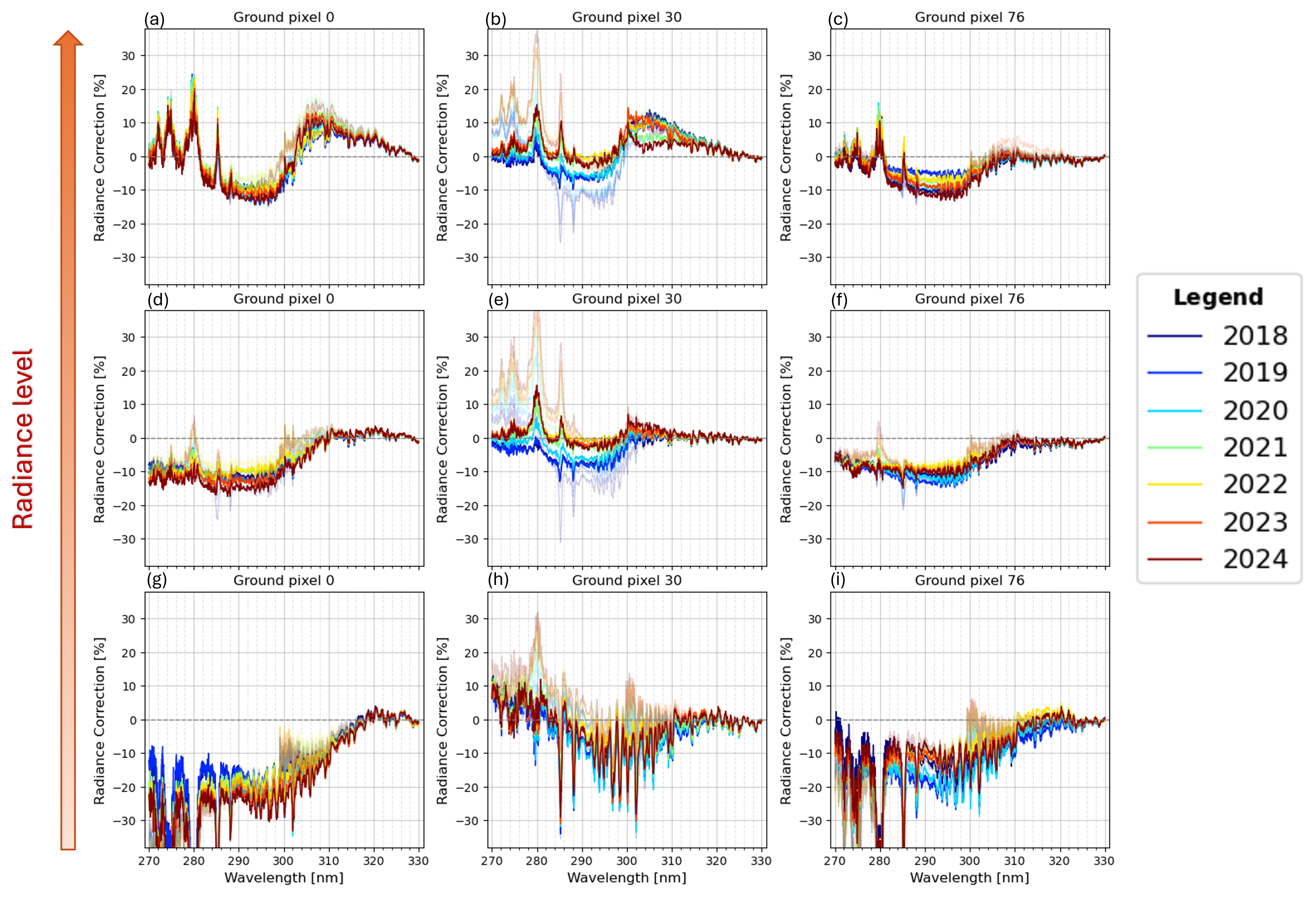 The correction spectra show a unique spectral dependency, with high peaks in the stronger solar absorption lines in band 1 and at the interface between the two bands (∼300 nm), and a concave negative shape between 280–300 nm. This spectral dependency, although different in magnitude, is similar for medium-high radiance levels, while for low radiance levels the correction magnitude is mostly negative (∼40 %) below 290 nm, as well as at the edges of the swath. The low signal in those edge regions (Fig. 11g–i) can be more sensitive to residual systematic effects, therefore residuals are more pronounced. Looking at the spectrum above >310 nm, the correction is often near zero. This is a consequence of the fact that the forward model uses a surface albedo fit in that spectral region as an anchoring constraint in the spectral region 328–330 nm, before computing the residuals themselves. We also note that this is not the case for other swath positions and radiance levels. This is expected as the variation in measured radiance and instrument response over different across-track positions and viewing angles cannot be fully captured by the scene albedo in the modelled radiances. Scene variability (e.g. especially high radinace in presence of tropical convective clouds) can also alter measured radiances relative to the clear-sky forward model.