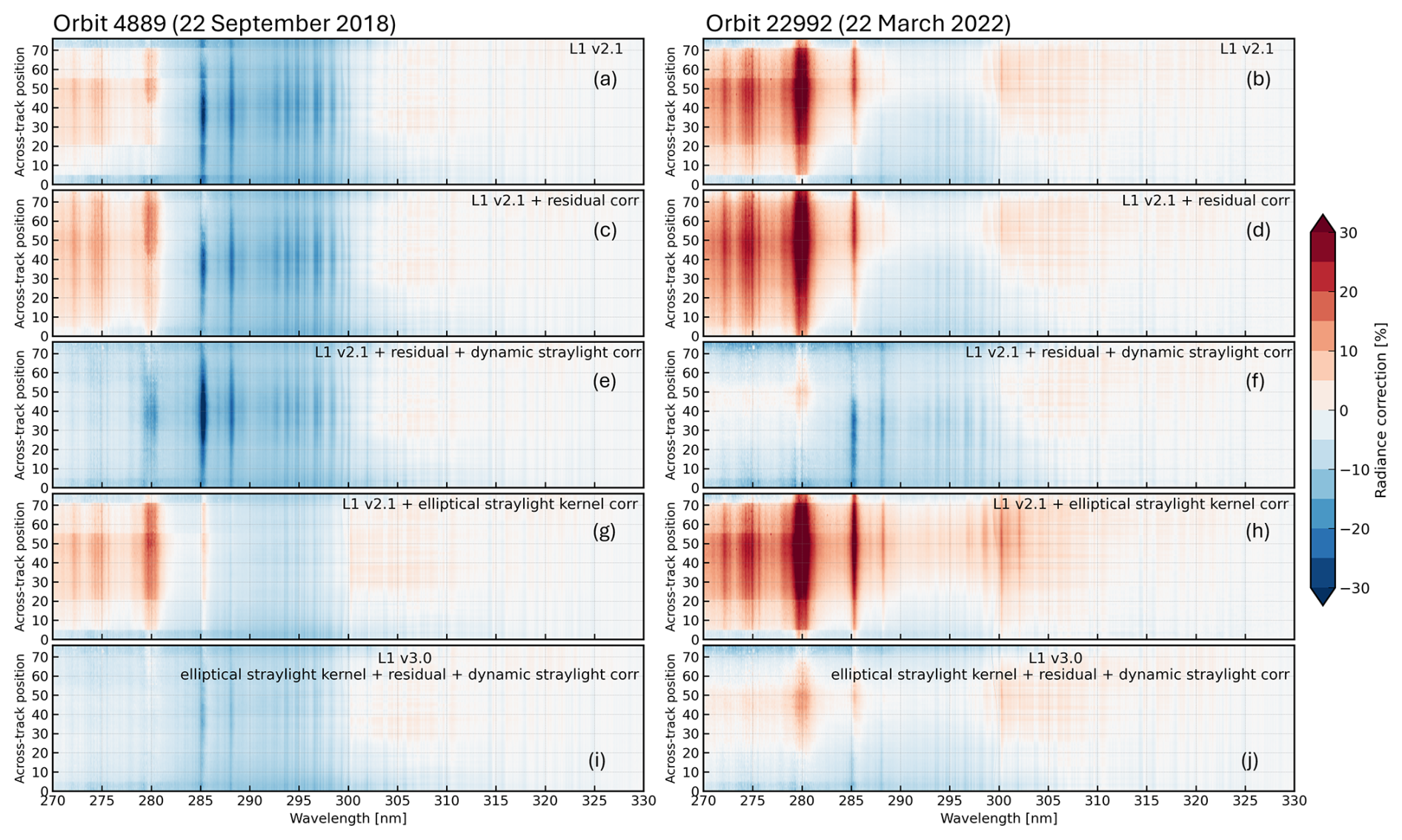 The top panels show the correction spectra computed with L1 v2.1 data (same spectra as in Fig. 11d–f, but for all the across-track positions and a single radiance level). In Fig. 12c and d, the residual signal correction is added to the L1 v2.1 processing. These spectra have a smoother behaviour in the across-track spatial dimension, which indicates that the residual correction addresses the band 1 row binning artifacts present in the top panels. The effect of both dynamic straylight correction and residual correction switched on in the L1 v2.1 processing is illustrated in the third panels. Compared to the top panels, these spectra show a reduction of the soft calibration correction magnitude of around 5 % in the whole spectral range. In addition, looking at the temporal increase of the soft calibration correction magnitude between the early and later orbit (left and right), we also note that this is ∼1 % lower than using L1 v2.1 processing, although still being present. This is expected because we know that the dynamic straylight correction has its limitation in the representation of the straylight inside the whole detector. The fourth panels show the soft calibration correction spectra using the elliptical straylight convolution kernel shape instead of the original symmetrical of the L1 v2.1 processing, with the residual and dynamic straylight corrections switched off. While we note an overall increase of the correction magnitude with respect to the top panel, this L1 processing with the elliptical straylight convolution kernel mostly decreases the systematic effects seen at the interface between bands 1–2 (285–300 nm), in both orbits. The temporal increase of the soft calibration correction magnitude between the two orbits is also ∼3 % lower than in the top panel. The last panels in Fig. 12i and j show the soft calibration correction spectra obtained using the L1 v3.0 processing, so data with all three L1 updates combined: the elliptical straylight convolution kernel, the dynamic straylight and residual signal correction algorithms. These panels clearly show smoother correction spectra in comparison with the top panel, in both the spatial and spectral dimension of the detector. The magnitude of the correction is ∼15 %–20 % smaller than in the top panel, depending on the radiance level and across-track position. The temporal increase of the soft calibration correction magnitude between the two orbits also decreased overall by ∼10 %–15 %, however still being present. It is also worth noticing the differences between the third and the last panels, where we can compare a similar L1 processing, except for the type of straylight convolution kernel used. In particular, we note that the large negative correction in the band 1 strong absorption lines disappears in both orbits when using the elliptical straylight kernel, and that the correction looks smoother also at the interface between bands 1–2.
