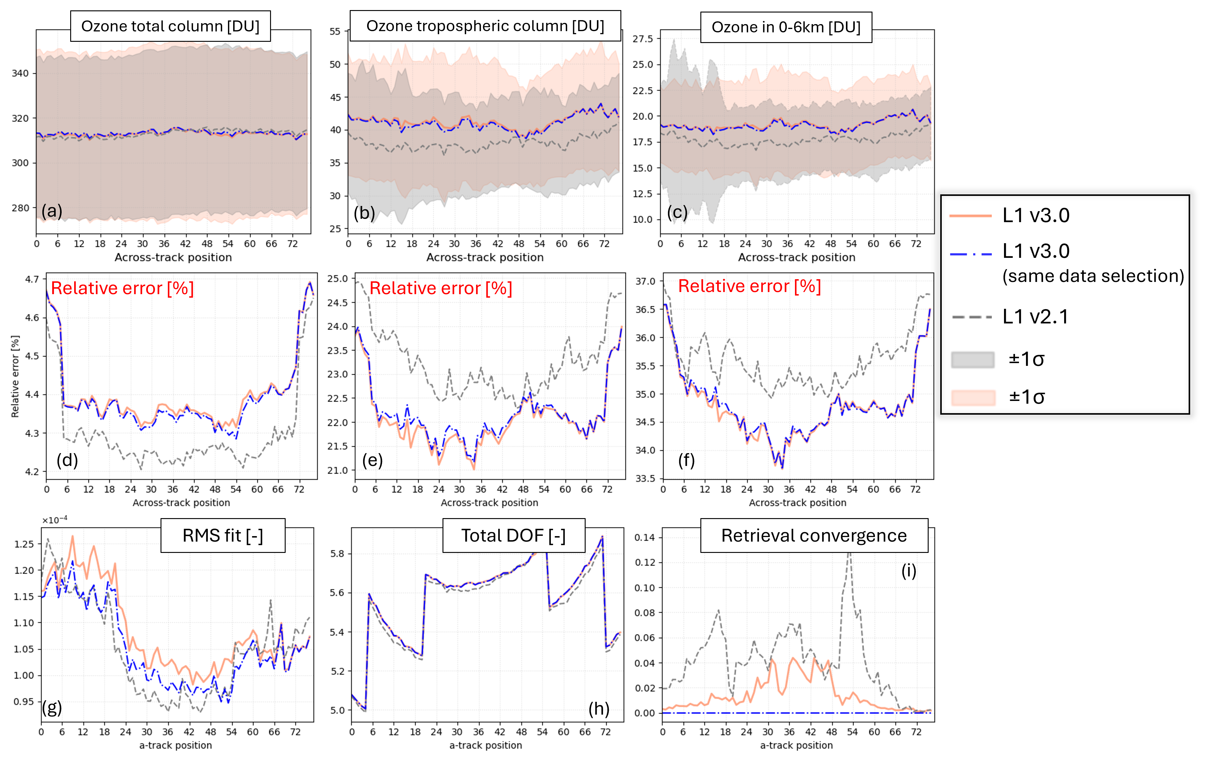 In this section, we examine the ozone profile retrieval for a single day (15 July 2024), obtained using L1 v2.1 and v3.0 input data. Figure 14 compares the two retrieval versions using along-track averages of several retrieved quantities. Along-track averaging is a useful diagnostic to identify potential across-track-dependent calibration effects. The first row displays the total, tropospheric and 0–6 km ozone columns, together with the their ±σ standard deviation (shaded areas). While no significant differences are observed in the total ozone column, both the tropospheric and the 0–6 km ozone columns show a smoother along-track behavior in the retrieval based on L1 v3.0 data. The second row displays the relative errors of the corresponding integrated ozone columns. Compared to L1 v2.1, the relative error of the total ozone column increases slightly by approximately 0.2 %, whereas the relative errors of the tropospheric and 0–6 km ozone columns decrease by about 1 %–2 %. The third row shows along-track averages of the root-mean-square (RMS) of the spectral fit, the total degrees of freedom (DOF), and the retrieval convergence metric. The RMS values are slightly higher in the L1 v3.0 retrieval (coral line); however, they exhibit a reduced across-track dependence, particularly over rows 24–76, compared to the L1 v2.1 retrieval (gray line). The total DOF is slightly higher than, or comparable to, the retrieval using L1 v2.1 input data. The retrieval convergence, which takes null values for successful retrievals, indicates an overall improved convergence for the L1 v3.0 retrieval. Because of this difference in convergence behaviour, the L1 v3.0 results were additionally restricted to match the number of successful convergences of the L1 v2.1 retrieval. The corresponding along-track averages are shown by the blue dash–dotted line. Under this matched convergence condition, the largest differences are observed in the RMS fit: while comparable values to L1 v2.1 are visible in the first part of the swath (rows 0–20), we note again that the L1 v3.0 retrieval exhibits a reduced across-track dependence for rows 24–76.
