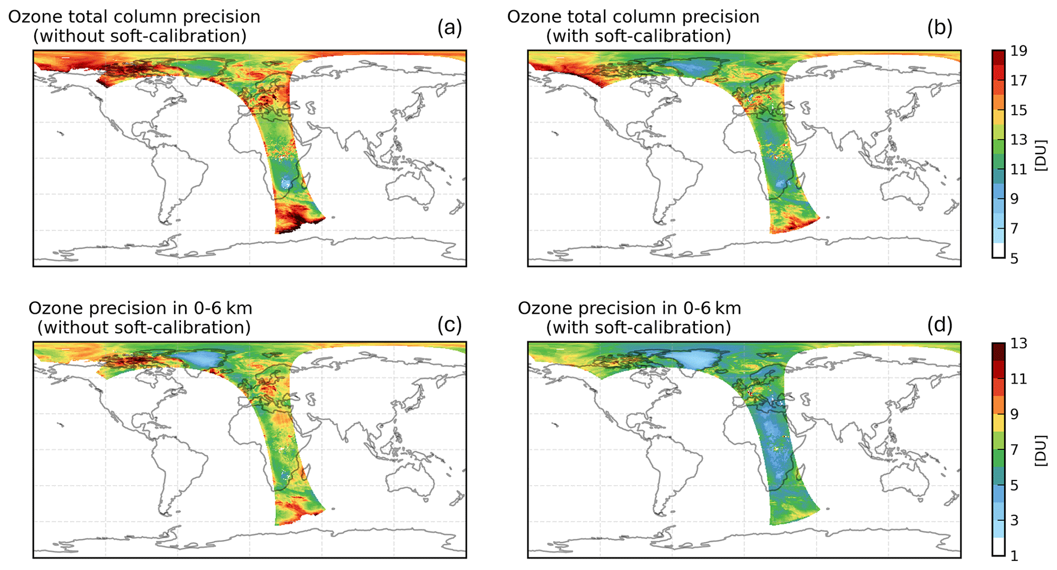 Figure B1Retrieved ozone total integrated column (a, b) and ozone 0–6 km integrated sub-column precisions (c, d) of orbit 19 452 (on 15 July 2021), without (left) and with (right) applying the soft calibration correction.