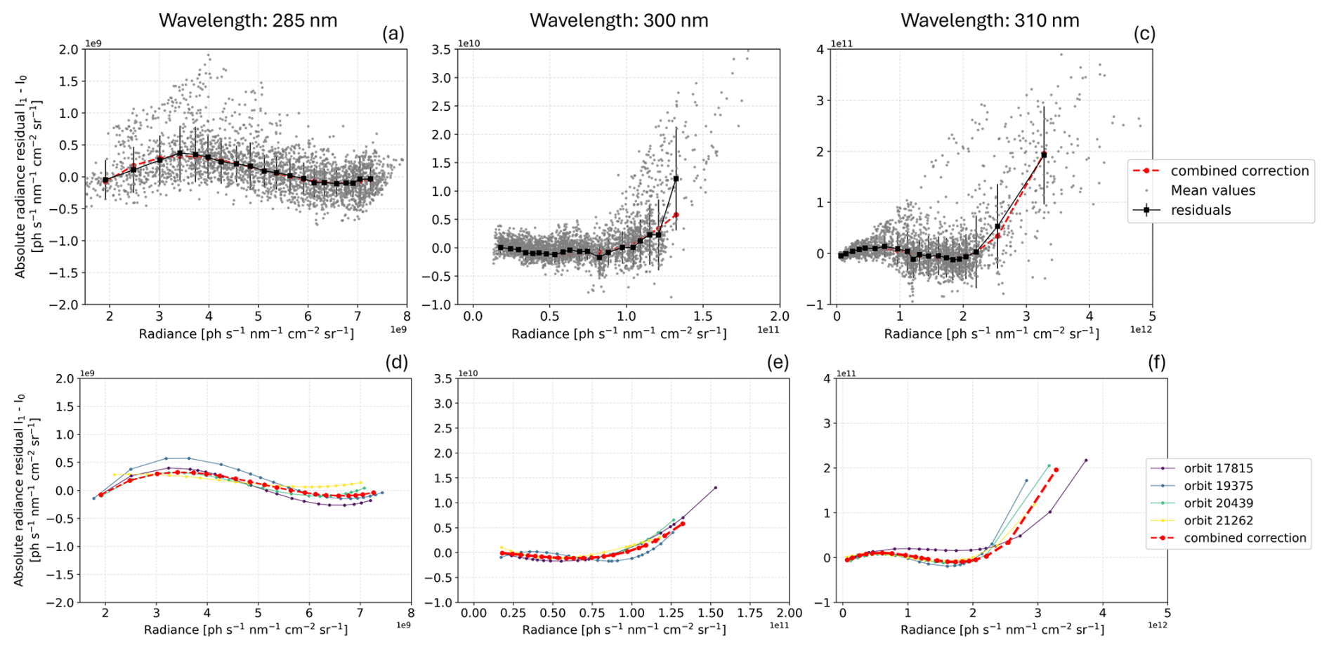 Figures (a)–(c) show the mean absolute radiance residuals computed from the forward model calculations of the L1 orbits chosen for the year 2021 (see Table A1) as gray dots, while the black and the red (dashed) line represent, respectively, the mean radiance value at the center of the 20 percentile bins and the values obtained from the polynomial fit. The correction (red dashed line) is basically implemented as a piecewise linear correction function of the radiance, wavelength and across-track position, and it can be seen that it has a strong spectral dependence. Figures (d) and (e) show instead the comparison between the yearly combined correction (red dashed line) and the single orbit correction of 2021, for the same across-track position and three wavelengths. The seasonal dependence is smoothed out in the combined orbit.