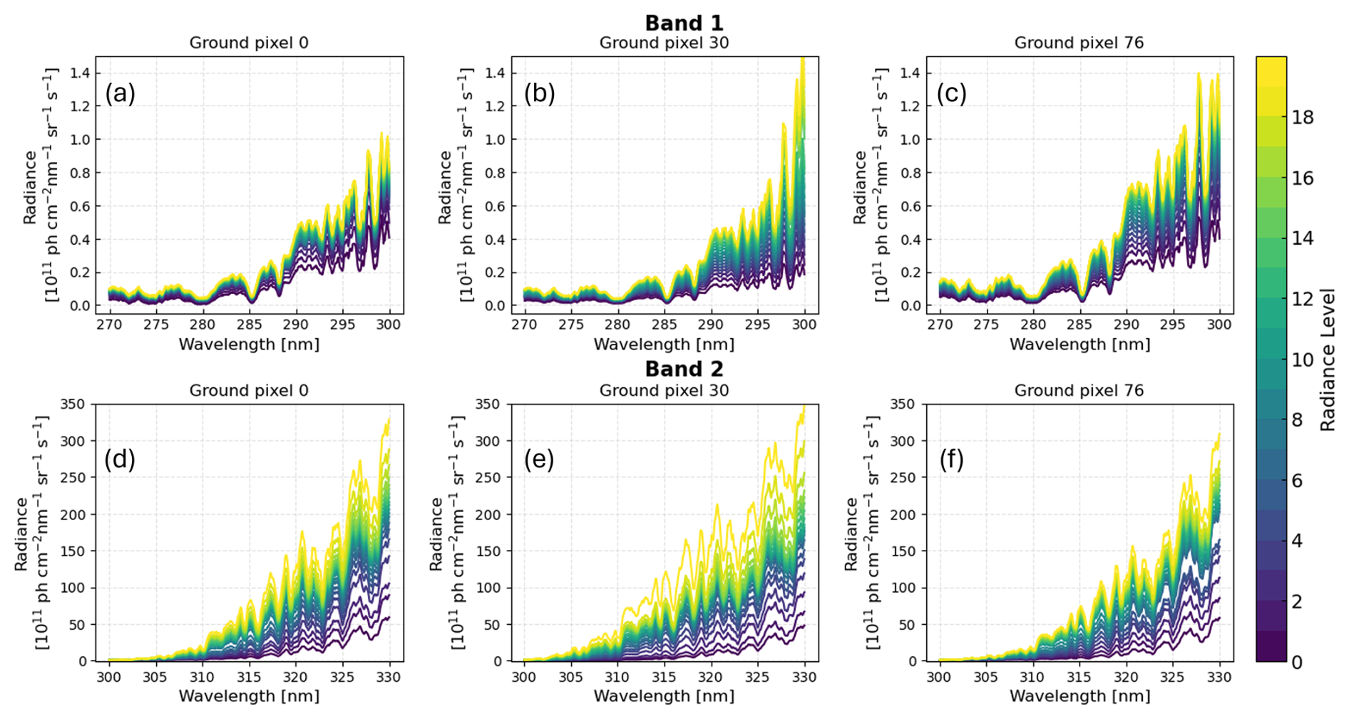 Figure B3Radiance levels of the 20 bins used for the soft calibration correction of orbit 22 992 (on 22 March 2022), for three across-track indices 0, 30, 76. Figures (a)(c) show the radiance levels in band 1 (267–300 nm), while (d)(f) in band 2 (300–330 nm).