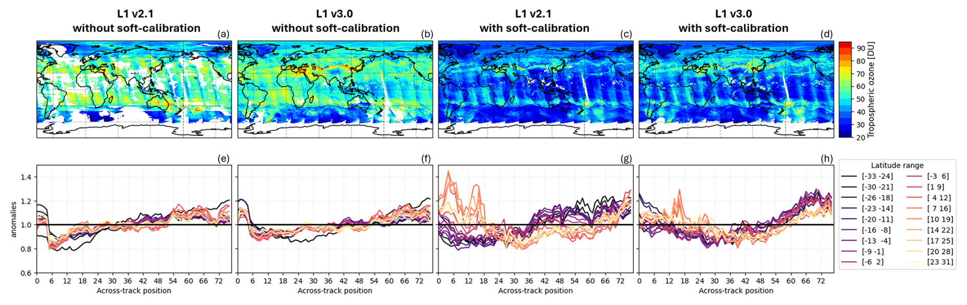 In Fig. 16, the across-track anomalies of the ozone tropospheric column are shown alongside the corresponding global maps for the same day (15 July 2024), with retrievals computed with and without soft calibration correction. Similar to (Bak et al.2025), the tropospheric ozone anomalies are calculated as the ratio of values at each across-track position to the swath-wide average (0–76). These ratios are evaluated in 18 latitude bands spanning 30° S–30° N, to avoid the gap in the Southern Hemisphere (Fig. 16a). When using the updated L1 v3.0 input data without soft calibration correction, the anomaly profiles exhibit a modest reduction in magnitude in the western and central parts of the swath compared to L1 v2.1 (Fig. 16f vs. Fig. 16e). With soft calibration applied, the anomaly profiles tend to show reduced variability across latitude bands, with individual profiles lying closer together when using L1 v3.0 (Fig. 16h vs. Fig. 16g). These visual tendencies hint that improvements in the L1 calibration may be associated with the changes in the across-track systematic structure. Moreover, the incremental influence of the soft calibration on the anomaly metric appears smaller when using L1 v3.0 than with L1 v2.1 (Fig. 16h–f vs. Fig. 16g–e).
