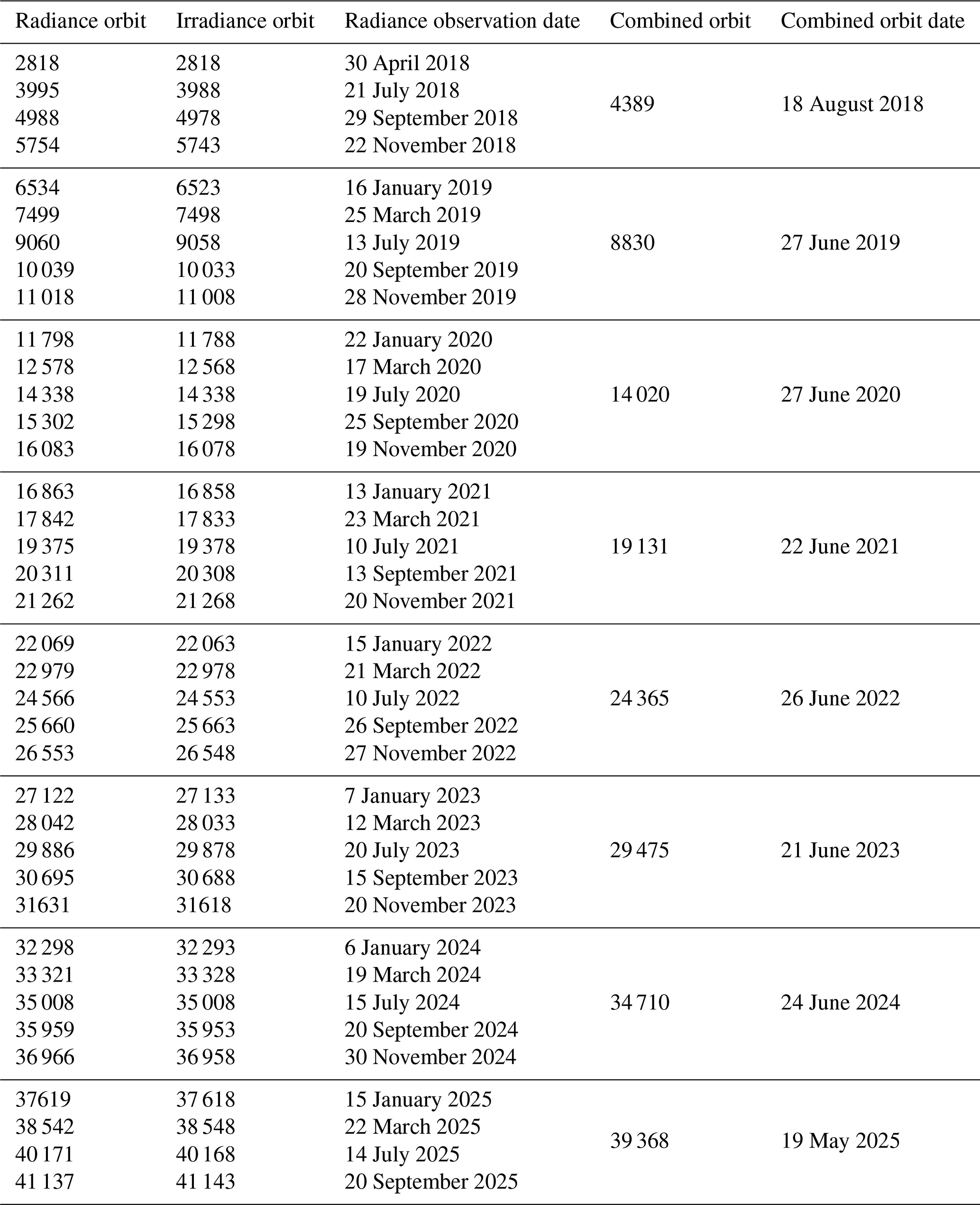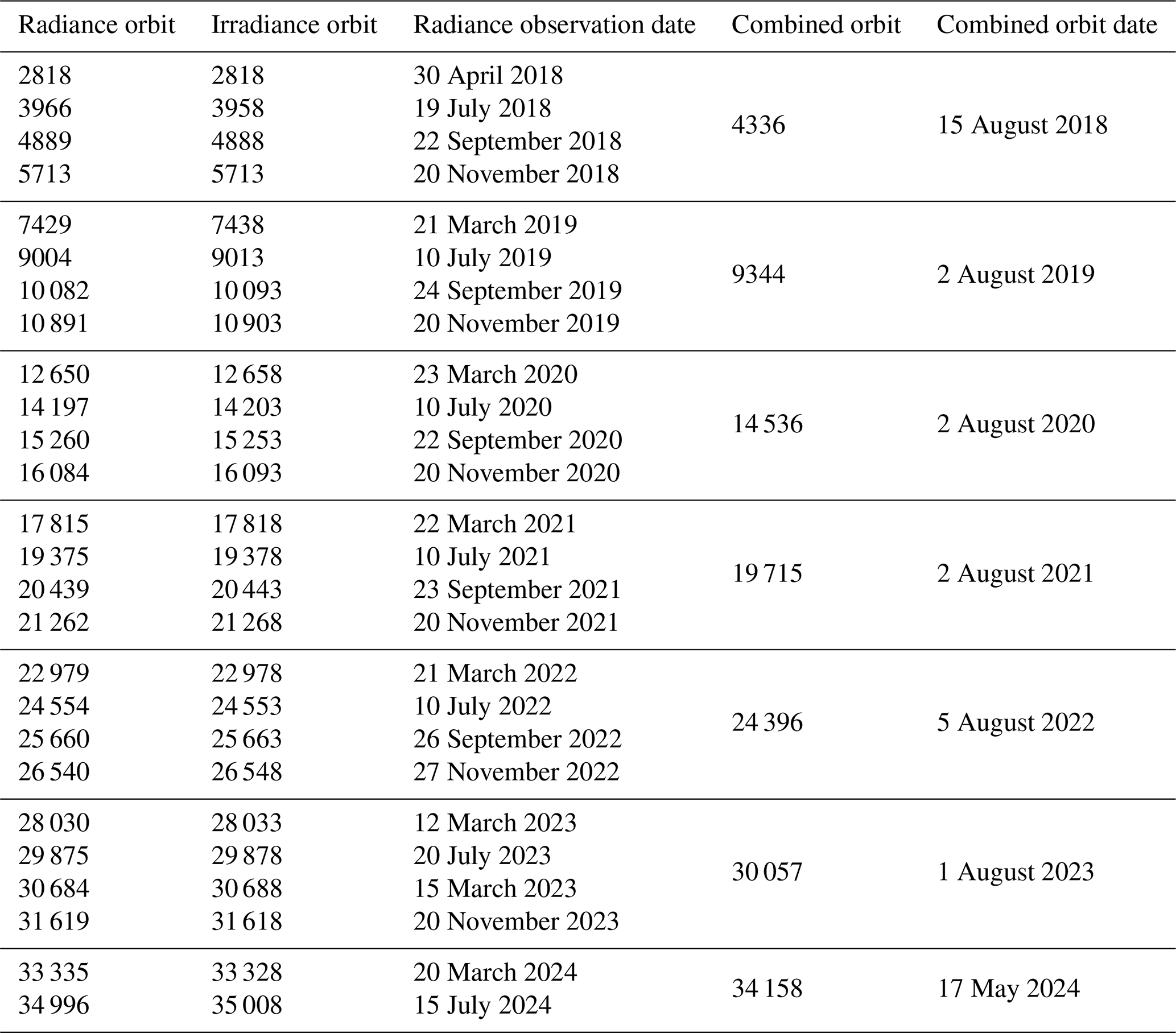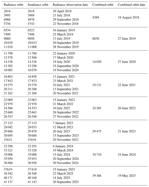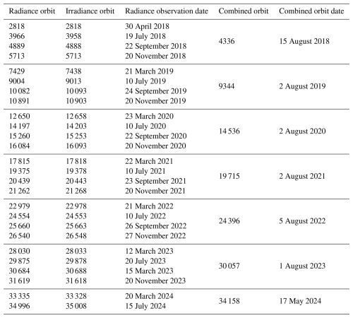 Table A2List of the TROPOMI bands 1–2 L1 orbits v3.0 used for the computation of the soft calibration correction in operation for the L2_O3_OPR v2.9.