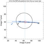 Using the sun-scans and ACE Imager data, two solid lines are created, representing the MAESTRO UV and Visible-NIR slits. From the azimuth scan, the positions of the half maximum from the UV and Visible-NIR scan data are identified as the endpoints of each slit, marked as squares along with the dashed circles. The slit positions identified during pre-launch ground tests at DFL are the dashed lines.