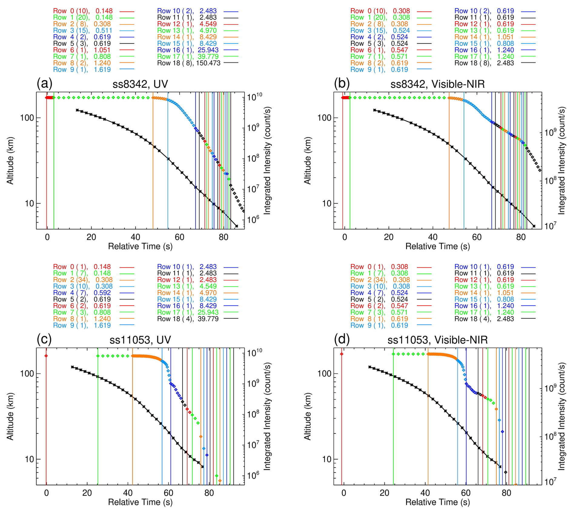 Figure 2MAESTRO spectral measurements during sunset occultations. (a, b) Occultation ss8342 on 1 March 2005, with a 30 km altitude tangent point at 01:38:54Z, located at 80.004° N, 161.137° W, and a beta angle of 38.099°, using an action table from set “A” applicable to the beta angle range of 30–45°. (a) Integrated UV spectrum intensity vs. time, with the colour code specified in the legend above the panel, and the tangent height vs. time curve (black) obtained from ACE-FTS data. MAESTRO and ACE-FTS times are aligned as described in Sect. 3.7. Left y-axis: altitude; right y-axis: integrated spectrum intensity. The coloured text lists the 19 rows of the action table set “A”, each marked by a colour code, with the number of repetitions in parentheses and integration time in milliseconds (ms). Vertical lines denote the start time of each row. (b) Same as panel (a), but for the Visible-NIR channel. (c, d) Occultation ss11053 on 1 September 2005, with a 30 km tangent point at 00:47:12Z, 79.265° S, 152.432° W, and with a beta angle of −38.037°, using an action table from set “B” applicable to the beta angle range of 34–42.5°. Otherwise, the same layout and conventions as panels (a) and (b).