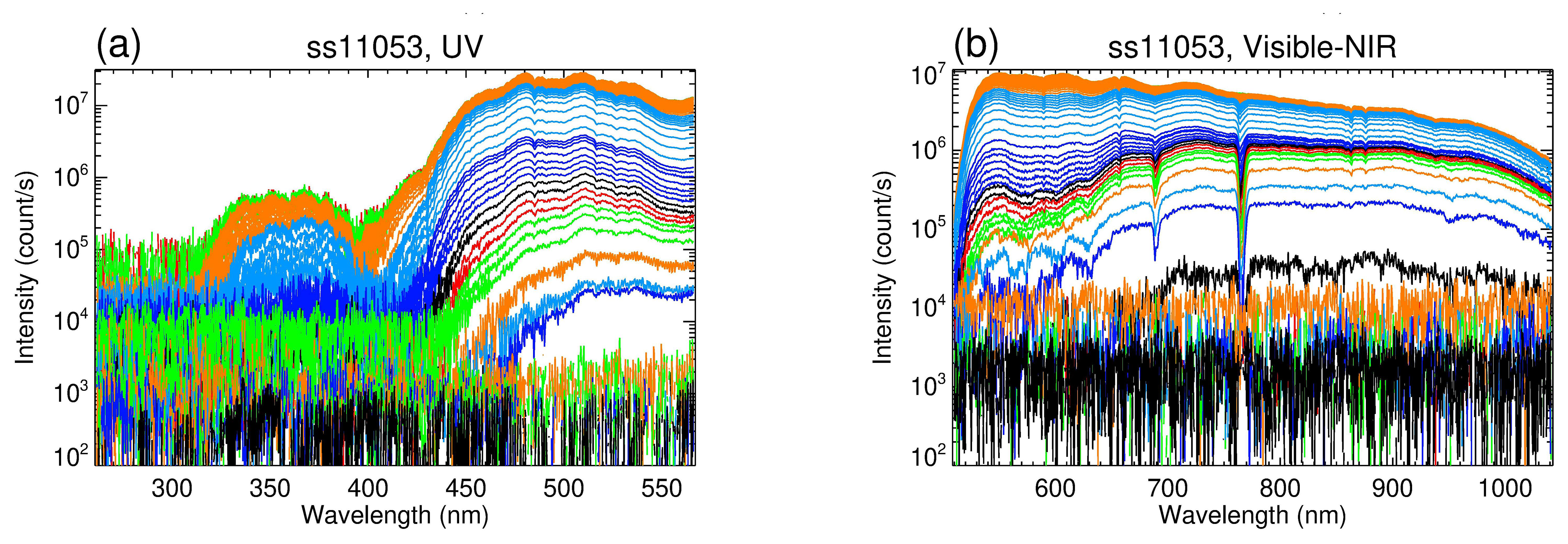 Set “B” was developed with more data points at higher altitudes (above 15 km), fewer at lower altitudes (below 15 km), and with more beta angle sub-ranges covering nine intervals with bounds at 0, 10, 25, 34, 42.5, 48.5, 53.2, 56.7, 58.2, and 59.4° and used from August 2005 to now. In addition, a separate scheme of 20 exo-atmospheric spectral measurements above 150 km was produced and included in the “B” tables. Figure 2c, d show an example of a spectral measurement time sequence for observation ss11053 on 1 September 2005 with a beta angle of 38° using “B” tables. One upper limit occultation measurement is taken at 150 km, and most measurement points are now located within the ozone layer. From 50 to 25 km, there are 34 points; from 25 to 20 km, 10; from 20 to 15 km, 7; and below 15 km, 21. On average, there are 1.5 measurements per 1 km. In Fig. 2c, d, very small spectral intensities at very low altitudes, well below the lowest ACE-FTS measurement altitude, are cut off. Compared to table “A” (Fig. 2a, b) with a similar beta angle, the occultation measurement time for table B (Fig. 2c, d) is longer by about 5 s. Hence, the measurements using “B” span a wider altitude range than “A”. Figure 3a, b show the 80 ss11053 spectra (after dark-count calibration) for the UV and Visible-NIR channels. It demonstrates the ability to capture signals across at least three orders of magnitude.