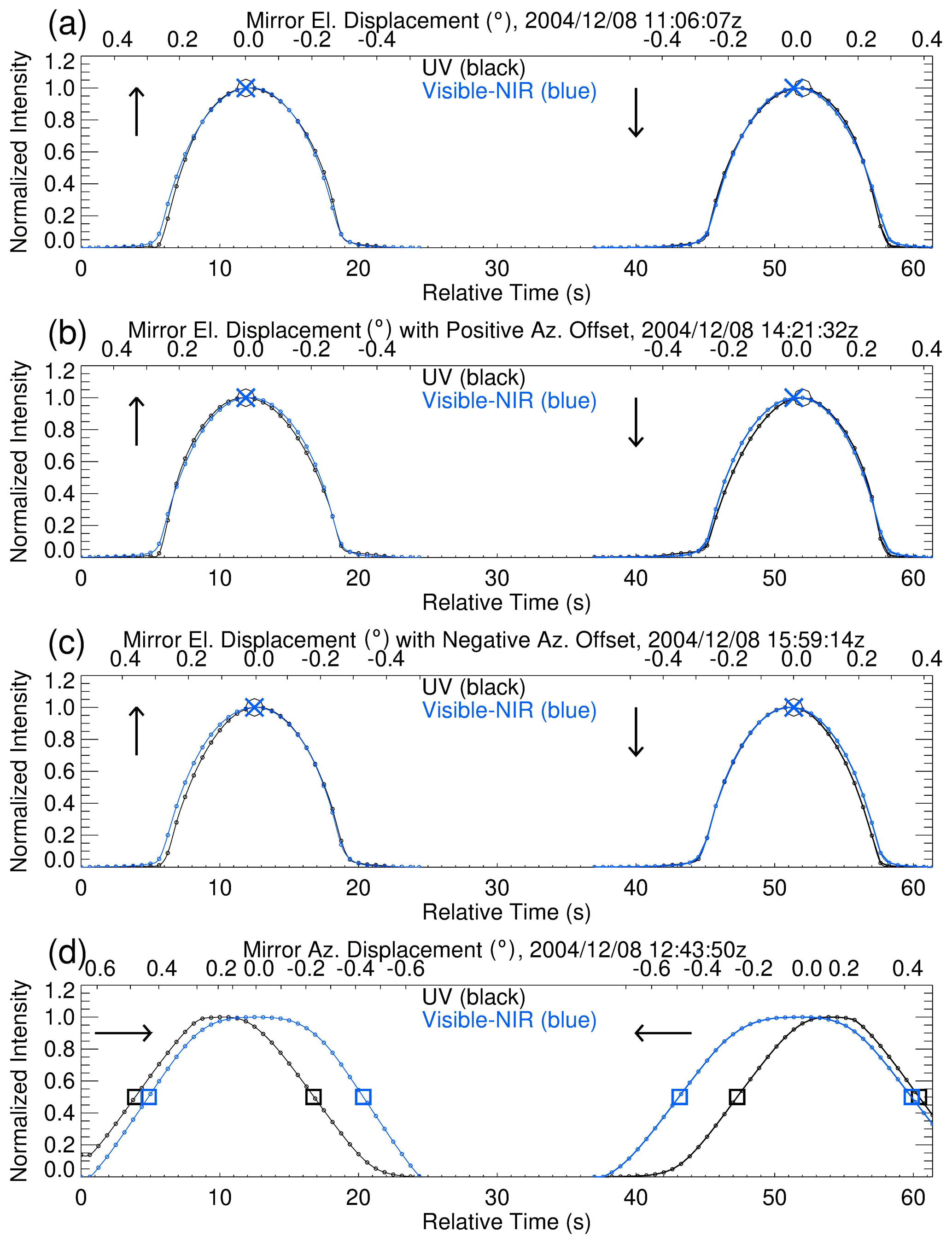 Figure 4From top to bottom, the integrated intensities from the MAESTRO UV (black) and Visible-NIR (blue) spectra recorded during the sun-scans. The top x-axes correspond to the sun tracker mirror displacements, in degrees, scanning in the elevation (El.) direction (a), in the elevation direction with positive (b) and negative (c) azimuth (Az.) offsets, and in the azimuth direction (d). The maximum intensities during the elevation scans are marked with an “x” for UV and a circle for Visible-NIR. Half-maximum intensities during the azimuth scans are marked with squares. The vertical arrows indicate upward and downward elevation scans, while the horizontal arrows indicate azimuth scans to the left and right.